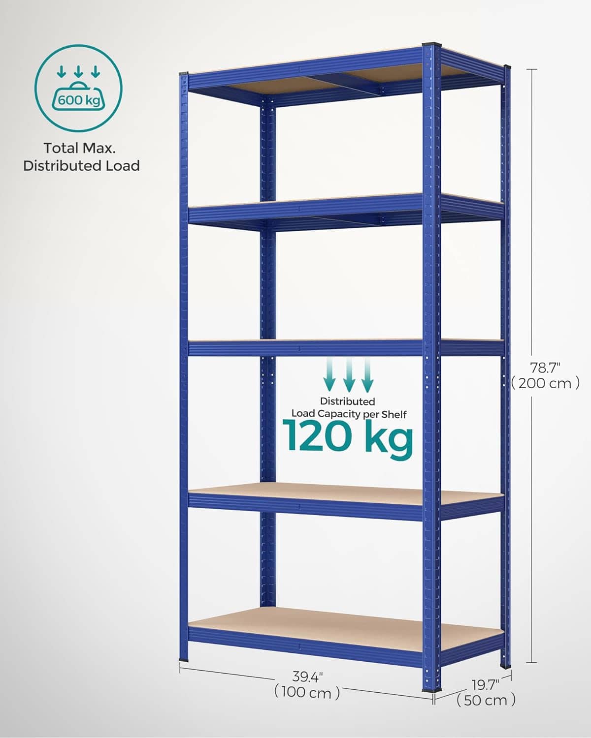 Raft de depozitare metalic, cu rafturi din PAL, 5 polite, max. 600 kg, 200x100x50cm, albastru Mob360