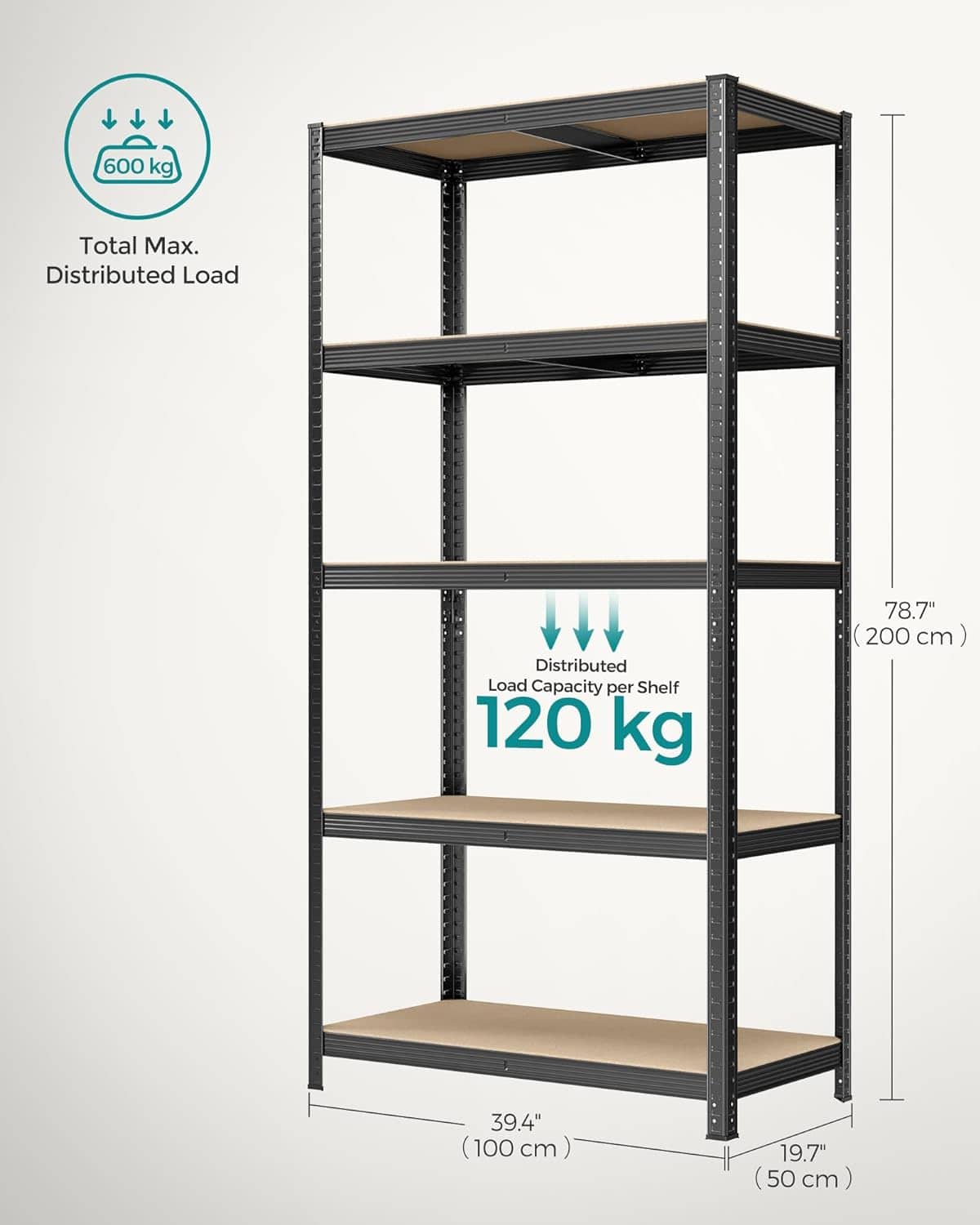 Raft de depozitare metalic, cu rafturi din PAL, 5 polite, max. 600 kg, 200x100x50cm, negru Mob360