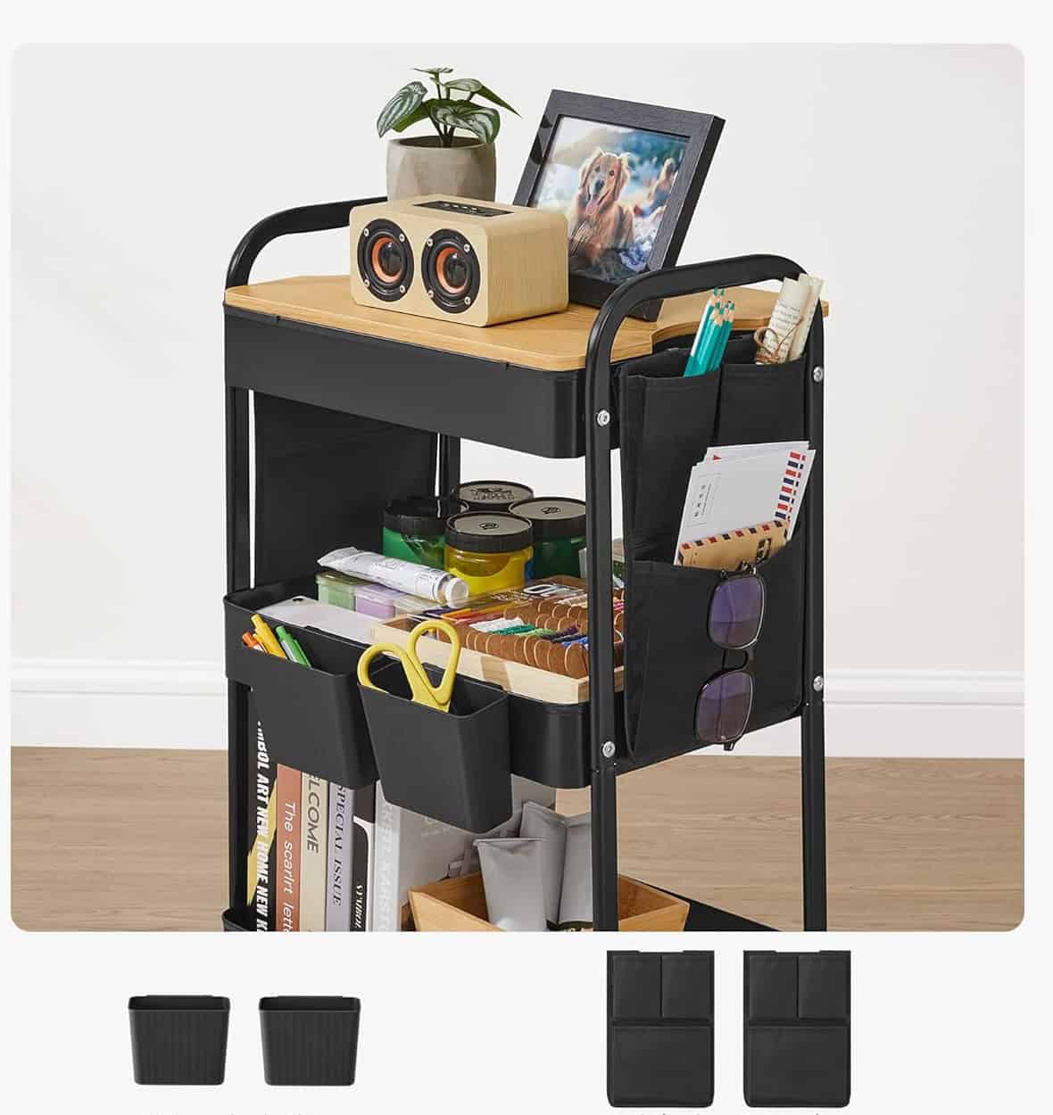 Ideal pentru organizarea in camera de zi, bucatarii si bai, sau poate fi folosit ca raft de depozitare si carucior pentru artizanat. Detalii produs: Culoare: Neagru Material: Otel Dimensiuni: 30.6 x 44.3 x 74.2 cm (D x L x H) Capacitate maxima de incarcare statica per raft: 10 kg Capacitate maxima de incarcare statica in total: 30 kg Despre acest articol Solid si durabil: Fabricat din otel de inalta calitate si MDF, acest carucior poate sustine pana la 30 kg in total. Acest raft cu cadru metalic solid va va insoti multi ani si va va satisface diferitele cerinte. Placa superioara detasabila: Aceasta placa superioara serveste drept capac si va protejeaza articolele de praf si murdarie. De asemenea, poate fi utilizata ca tava, ideala pentru articole mai mici – un ajutor practic de zi cu zi. Spatiu suplimentar pentru agatat: Acest carucior de servire negru cu 2 recipiente de agatat si 2 organizatoare laterale va ajuta sa va pastrati obiectele mici organizate si la indemana, si sa aduceti mai multa ordine in casa dvs. Versatil: Utilizati acest raft in diferite incaperi ca un carucior decorativ, carucior de baie, carucior de bucatarie, carucior de artizanat, carucior de servire, raft de depozitare sau carucior de unelte, in functie de dorintele dvs. Usor de asamblat: Datorita instructiunilor clare si pieselor marcate, puteti asambla cu usurinta acest carucior. Cu 4 roti rotative, dintre care 2 cu frane, acesta poate fi deplasat fara probleme si blocat daca este necesar.