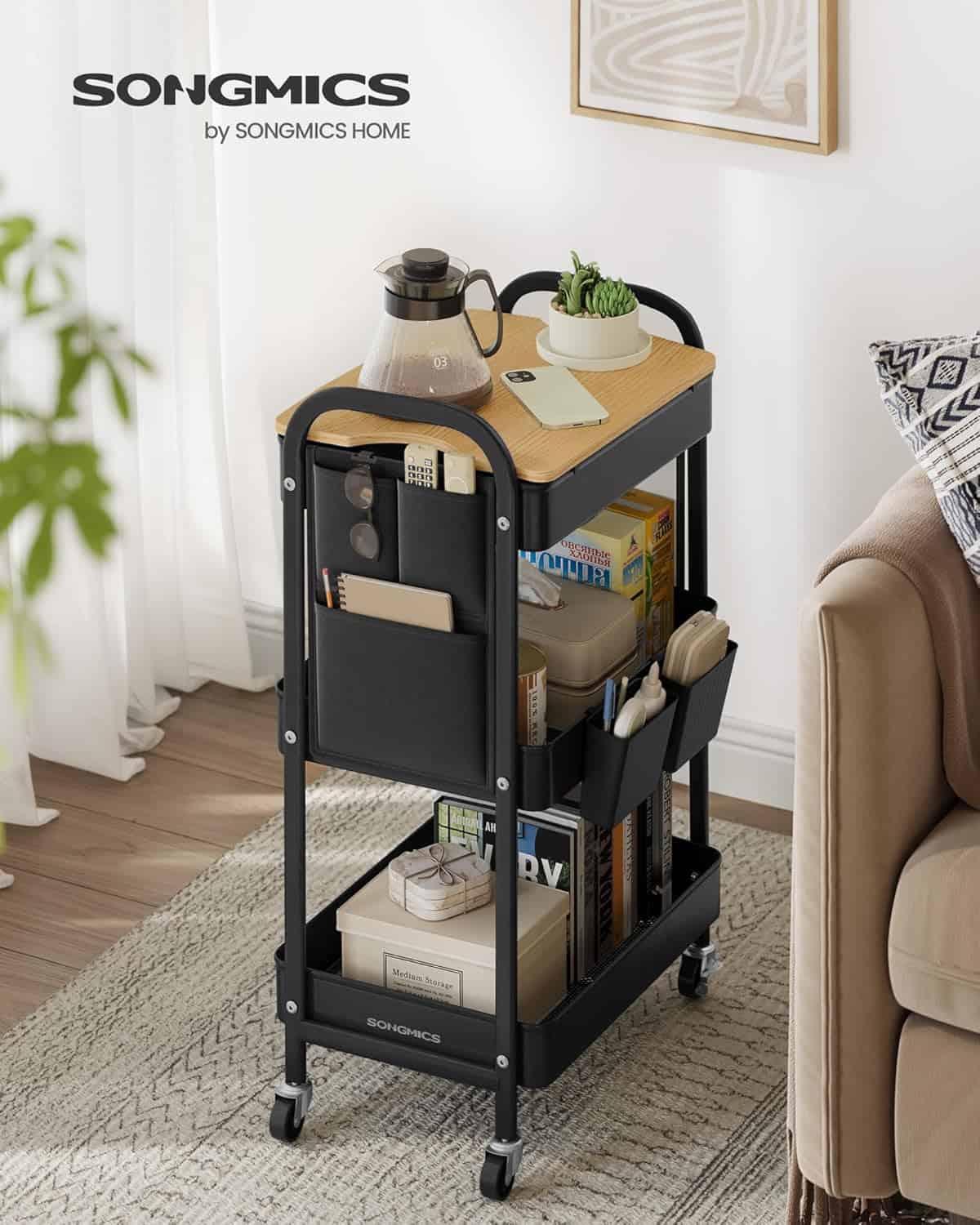 Raft de depozitare mobil tip carucior rulant, pentru baie sau bucatarie, cadru otel cu blat MDF, 31x44x74 cm, negru Mob360 – produs disponibil în magazinul Mob360.