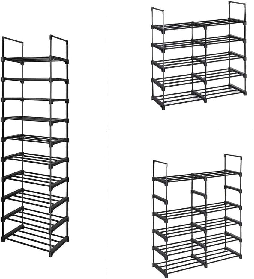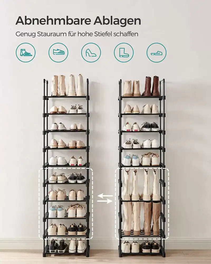 Specificatii: Culoare: negru Material: tub metalic, conector din plastic Dimensiune produs: 30 x 45 x 174 cm (L x l x H) Greutate produs: 3,1 kg Max. Capacitate de incarcare statica pe nivel: 5 kg Continutul pachetului: 1 x suport pentru pantofi cu 10 niveluri 1 x Geanta pentru accesorii 2 x Kit anti-rasturnare 1 x Instructiuni Despre acest articol Spatios, dar care economiseste spatiu: Datorita siluetei sale subtiri, acest suport de pantofi cu 10 nivele ocupa putin spatiu pe podea, dar ofera suficient spatiu de depozitare pentru 20 de perechi de pantofi. Rafturi detasabile: Daca doriti sa depozitati cizme inalte sau cutii de depozitare, este suficient sa scoateti un raft al suportului de pantofi metalic pentru a crea un spatiu amplu. Robust, rezistent si stabil: Fabricat din tuburi metalice ingrosate si conectori din plastic de calitate, fiecare nivel al acestui raft inalt pentru pantofi are o capacitate de pana la 5 kg, fiind sustinut de 4 tuburi metalice robuste si durabile. Kitul anti-inclinare ii sporeste stabilitatea Asamblare flexibila: Acest organizator pentru depozitarea pantofilor poate fi asamblat in diferite forme. De asemenea, il puteti imparti in 2 mici si le puteti folosi separat in camere diferite – totul se bazeaza pe nevoile dvs. Usor de asamblat: O structura simpla, un design practic de conectare, instructiuni ilustrate si piese clar etichetate – acest suport de pantofi subtire este usor de asamblat fara unelte.