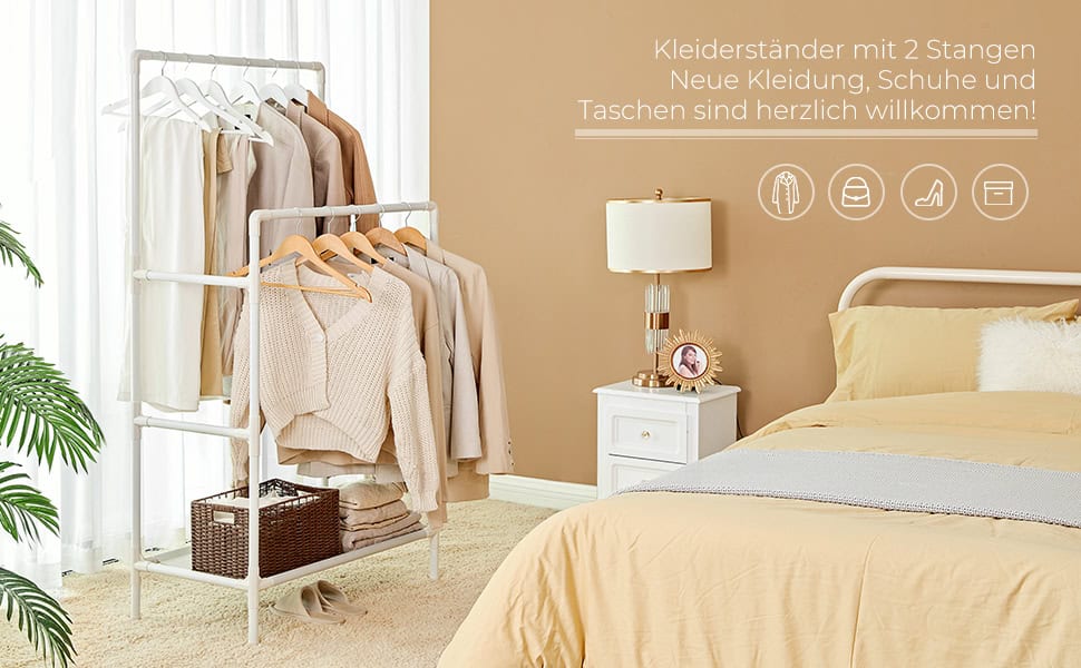 Marca: SONGMICS Culoare: Alb Dimensiuni produs: 45D x 83L x 157H cm Despre acest articol Siguranta este o prioritate! Vechiul dvs. suport de haine pur si simplu s-a destramat si toate hainele dvs. au aterizat pe podea? O catastrofa totala! Suportul nostru pentru haine este diferit. Fabricat din tuburi metalice robuste (diametru 25 mm; grosime pereti 0,25 mm) si tesatura netesuta premium de 110 g/㎡, este intotdeauna stabil si poate suporta greutati de pana la 70 kg.Mai mult confort toata ziua: Cand veniti acasa de la serviciu, cu siguranta doriti sa va asezati pe canapea si sa va relaxati, nu-i asa? Opriti-va!!! Inca mai trebuie sa instalati acest cuier… Nu va faceti griji! Asamblarea se face in cel mai scurt timp, nu necesita unelte.Totul intr-un singur loc: Este o idee buna! Rochii si costume pe cele 2 bare, genti si pantofi pe raft, esarfe si cravate pe traversele laterale. De acum incolo, nu trebuie decat sa aruncati o privire la acest suport de haine dimineata pentru a alege tinuta potrivita.Unde sa puneti acest suport pentru rochii? In dormitor sau in dressing pentru a va depozita hainele, pantofii si gentile; in hol pentru a agata hainele oaspetilor; pe balcon pentru a va usca rufele la aer liber Acest cuier cantareste doar 2,8 kg si poate fi transportat cu usurinta oriunde.Ce veti primi: Un cuier cu 2 sine care va aduce ordine in casa dvs. De asemenea, va punem la dispozitie instructiuni detaliate si elemente numerotate pentru a facilita asamblarea.
