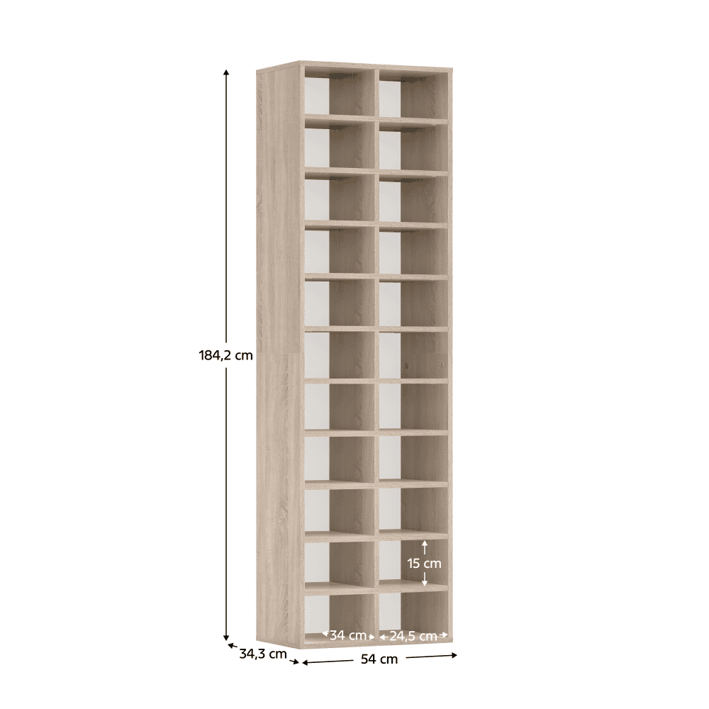 Material: DTD laminat Culoare: stejar sonoma Dimensiuni (Lxlxh): 54×34,3×184,2 cm Grosimea materialului: 1,6 cm Depozitare deschisă Dimensiuni rafturi universale pe două rânduri (Lxlxh): 24,5x34x15 cm Portanţă poliţă: 5 kg Pe glisoare Polivalent Produs slovac de calitate Recomandăm fixarea pe perete Livrat dezasamblat
