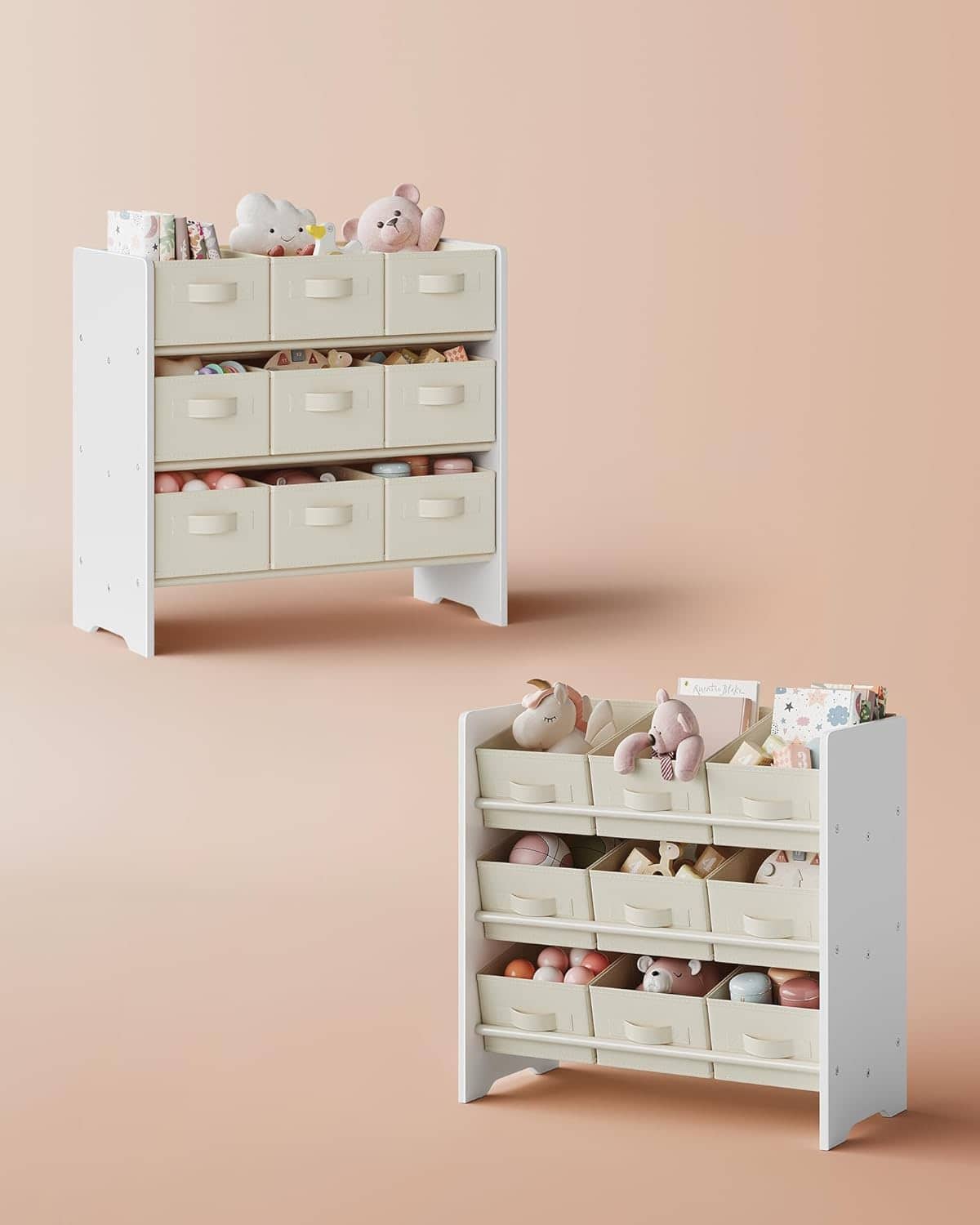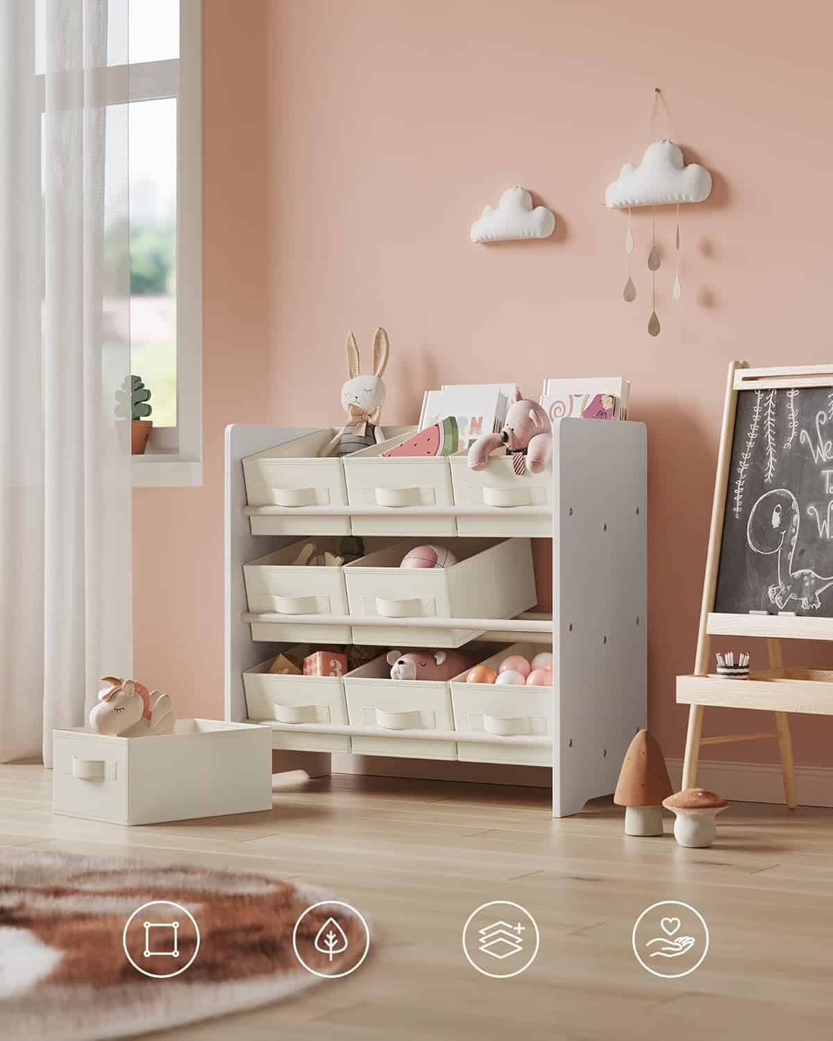 - Raftul pentru copii SONGMICS ofera o solutie eficienta si sigura pentru organizarea jucariilor si cartilor celor mici. Constructia din MDF si cele 9 cutii textile detasabile permit o depozitare flexibila si accesibila. Colturile rotunjite, suprafetele netede si sistemul anti-rasturnare il fac ideal pentru camera copilului, dar si pentru living sau hol. Caracteristici principale: