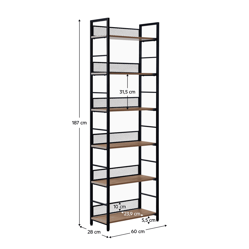 Material: metal / DTD laminat Culoare: neagră / stejar Dimensiuni (Lxlxh): 60x28x187 cm Portanţa fiecărei poliţe: 10 cm Grosime material: 1,5 cm Dimensiunile poliţei (Lxh): 60×23,9 cm Înălţimea dintre poliţe: 31,5 cm Înălţime picioare: 5,5 cm Spaţiu de depozitare deschis şase zone de depozitare Construcţie metalică Multifuncţional Modern Practic Combinabil cu KELER TIP 1-3 Recomandăm a se fixa pe perete Livrat dezasamblat