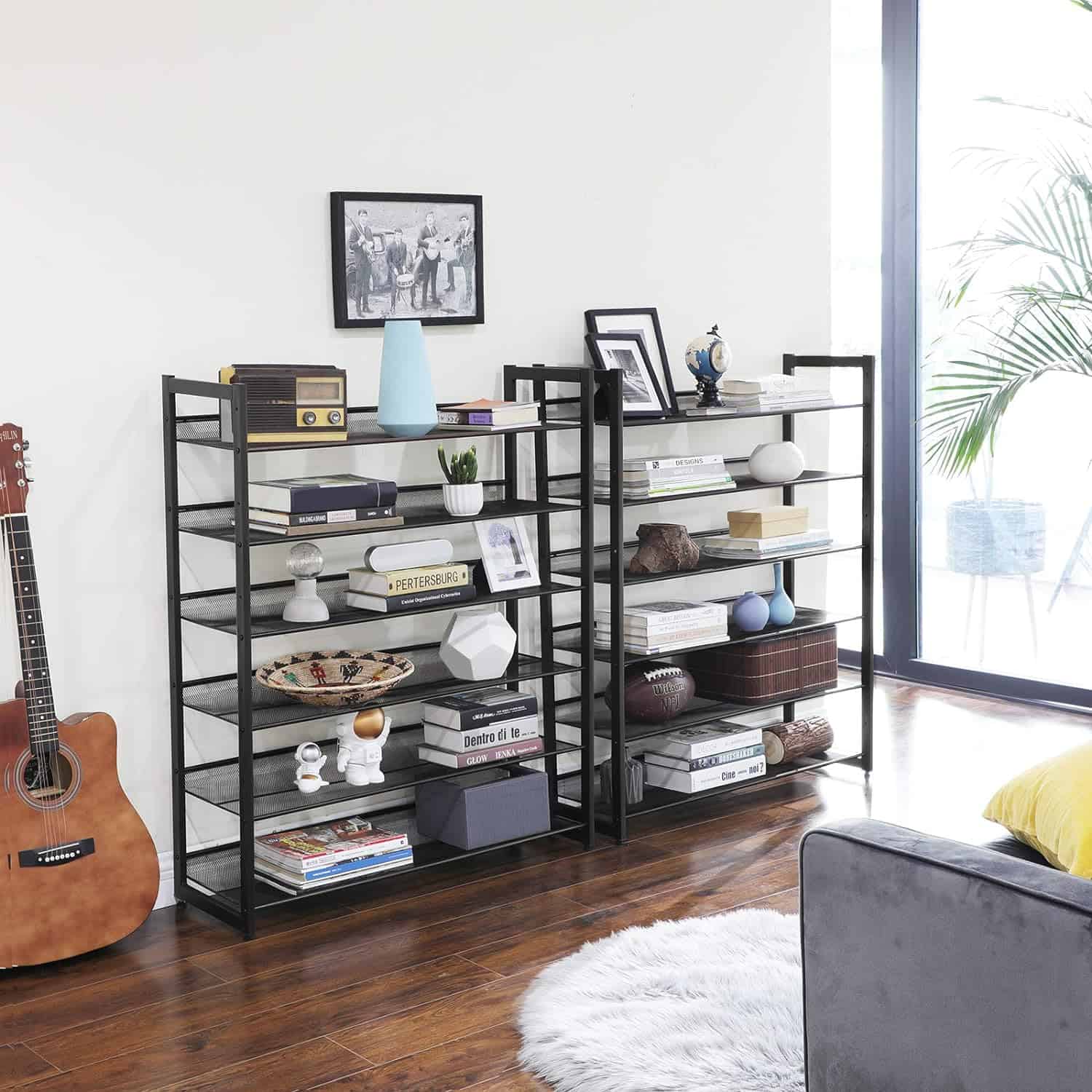 Detalii despre produs: Culoare: Negru Material: Otel Dimensiuni: 92,5 x 30,7 x 223 cm (L x l x i) Max. Capacitate de incarcare statica per raft: 10 kg Despre acest articol Proiectati acest raft in functie de nevoile dvs.: stivuiti cele doua rafturi cu 6 nivele unul peste celalalt sau folositi-le separat. Decizia va apartine!Cu o distanta de 18,5 cm intre rafturi, acest suport de pantofi ofera suficient spatiu pentru adidasi, pantofi cu toc si chiar cizme inalte.Fiecare raft poate transporta 4 perechi de pantofi barbatesti sau 5 perechi de pantofi de dama (pana la 10 kg) si ramane stabil chiar si la sarcina maxima. Pentru mai multa siguranta, folositi dispozitivul de protectie impotriva inclinarii (inclus) atunci cand stivuiti rafturile de pantofi unul peste celalalt.Ce primiti: 2 organizatoare de pantofi, fiecare cu 6 rafturi.