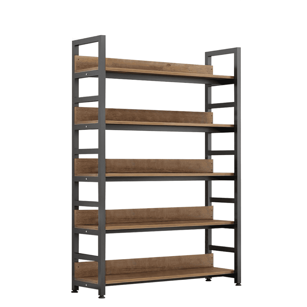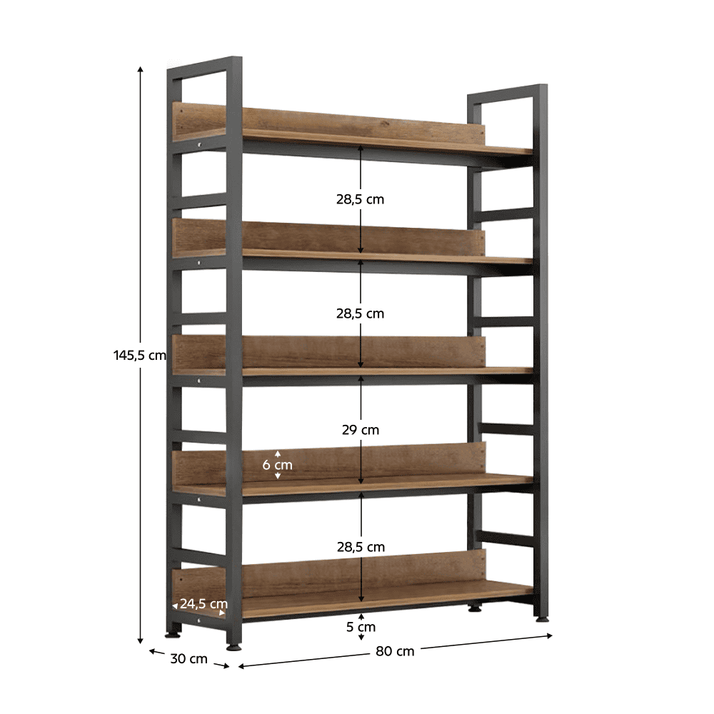 Material: MDF laminat/metal Culoare: stejar închis/negru Dimensiuni (Lxlxh): 80x30x145.5 cm Grosime MDF: 1,2 cm Înălţime picioare: 5 cm Cu poliţe Portanţă poliţă: 5 kg Depozitare deschisă Cinci spaţii de depozitare Multifuncţional Modern Practic Recomandăm fixarea de perete Livrat dezasamblat
