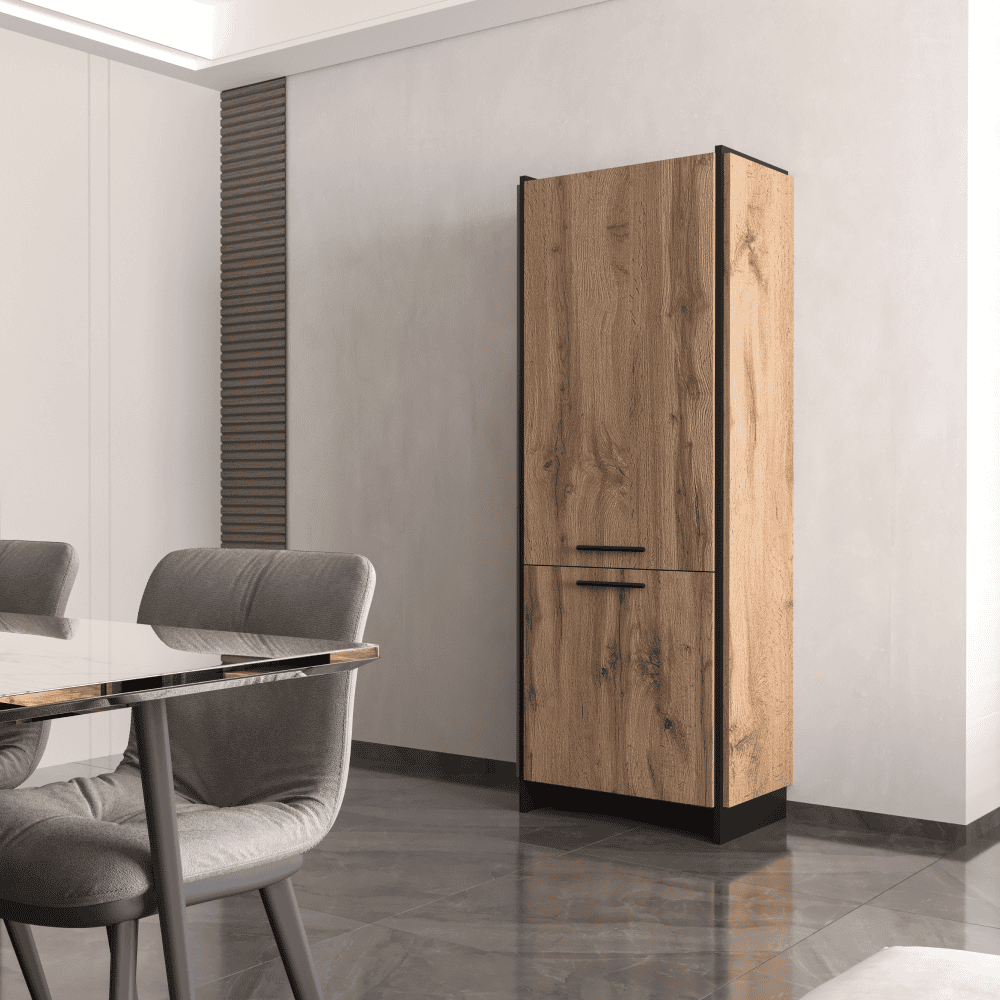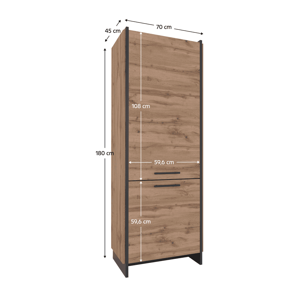 Material: DTD laminat/margini ABS Culoare: stejar wotan/negru Dimensiuni (Lxlxh): 70x45x180 cm Grosime material: 1,6 cm Mânere metalice Culoarea mânerului: negru Cu două uşi Cu poliţe Portanţa per poliţă: 5 kg DTD dublu laminat Picioare din plastic Design modern Vă recomandăm să fixaţi mobilierul de perete Livrat dezasamblat
