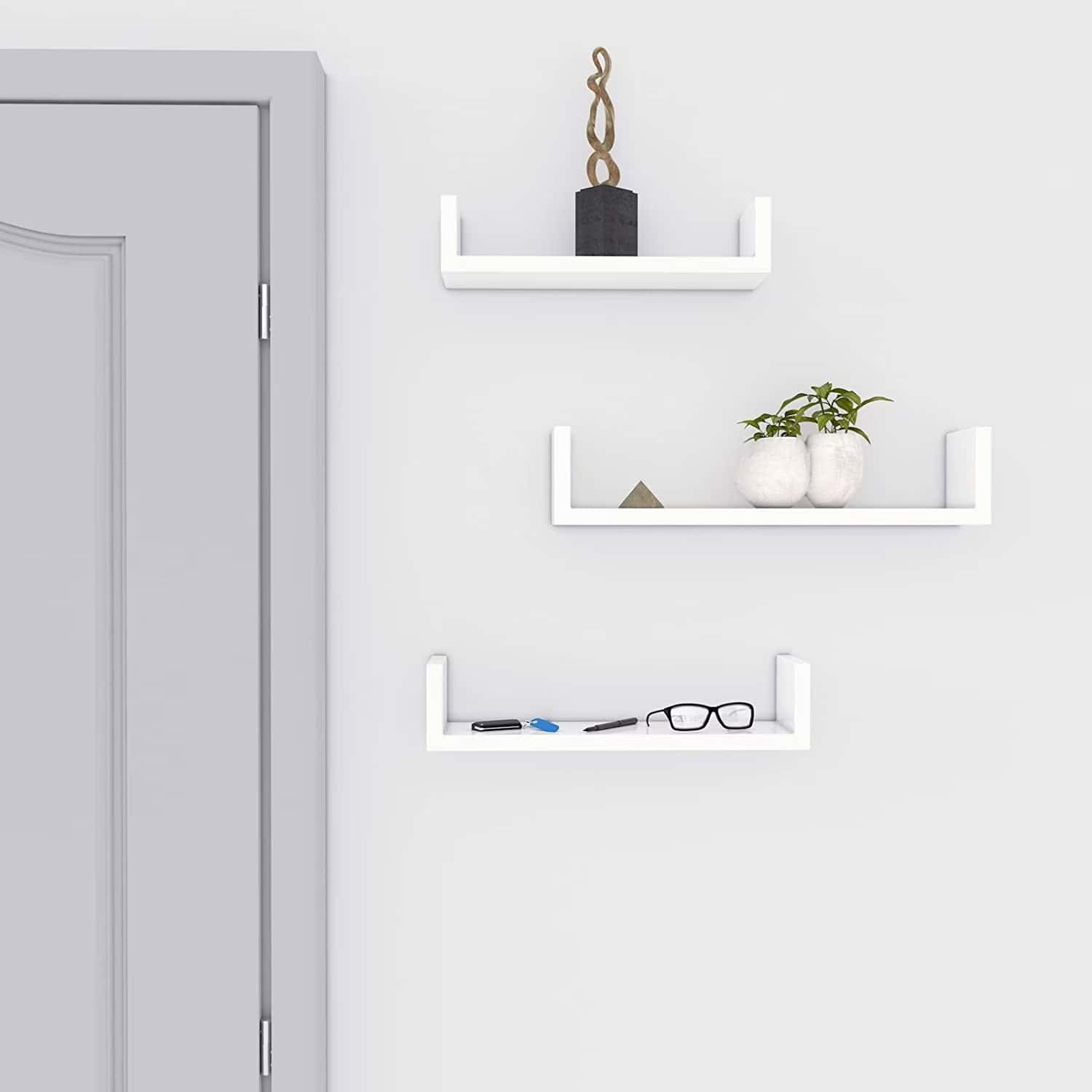 Specificatii: Culoare: Alb Material: MDF Dimensiunea produsului: Dimensiunea raftului mic: 10 x 30 x 7 cm (D x L x H) Dimensiunea raftului mediu: 10 x 35 x 8 cm (D x L x H) Dimensiunea raftului mare: 10 x 40 x 9 cm (D x L x H) Numar de rafturi: 3 Caracteristica speciala: Economie de spatiu, usoara, durabila Despre acest articol Cu suprafete albe lucioase, aceste 3 rafturi de perete uimitoare pot fi combinate in diferite moduri pentru a adauga caracter peretilor, oferind in acelasi timp spatiu pentru a afisa decoratiuni sau fotografii. Solide si durabile: Rafturile plutitoare din PAL de inalta calitate sunt puternice si durabile. Fiecare raft de perete poate suporta pana la 5 kg. Fara cadere: Panourile laterale ale acestor rafturi protejeaza cartile, CD-urile si DVD-urile impotriva caderii, oferind un oferind un suport mai sigur. Instalare usoara: Pur si simplu gauriti in perete, instalati rafturile cu suruburile furnizate si gata. De asemenea, sunt incluse instructiuni clare pentru a va ajuta.Un set de 3 rafturi de perete cu o forma unica de U care nu ocupa spatiu pe podea; in schimb, creeaza spatiu suplimentar in camera de zi, birou, baie sau bucatarie.