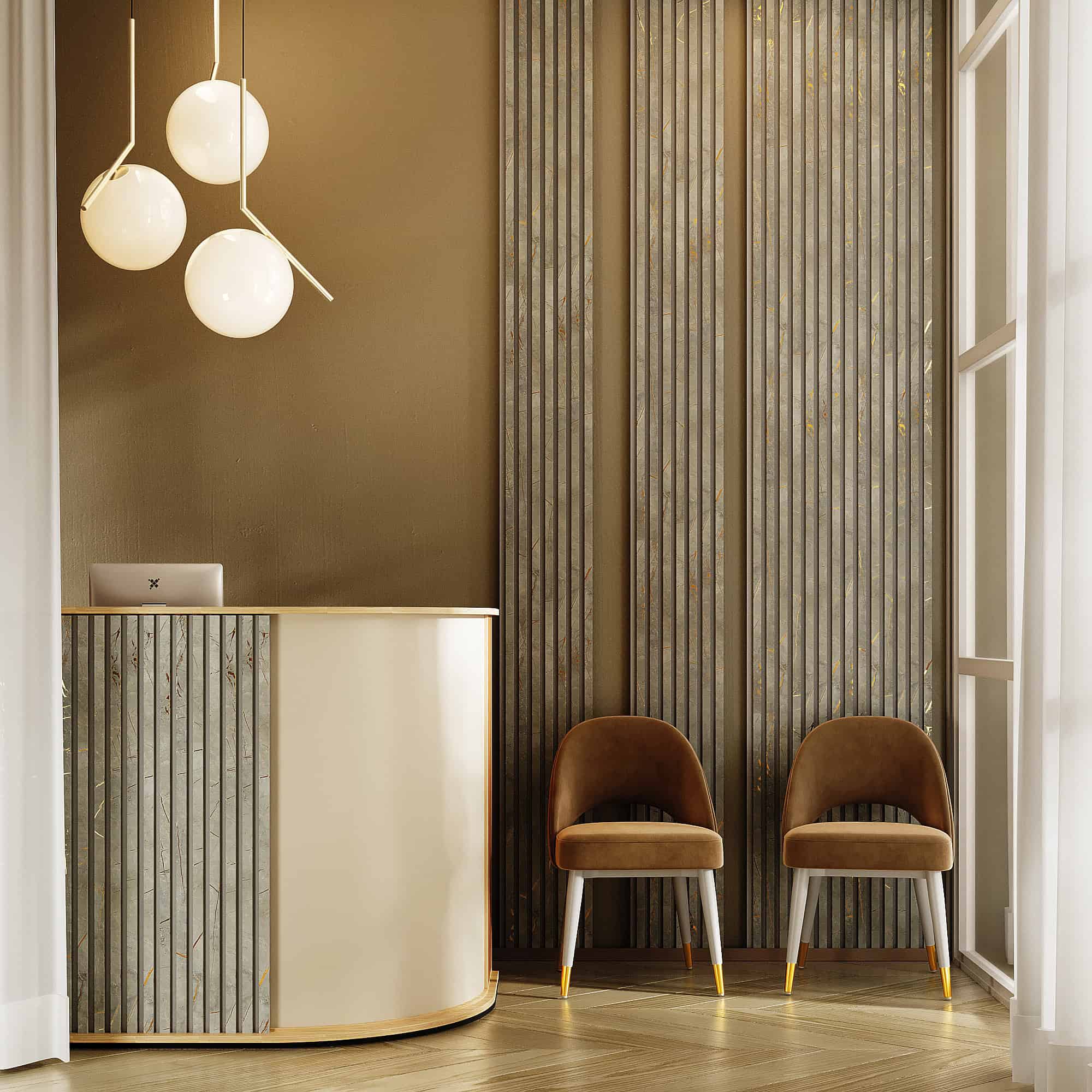 Riflaj MDF decorativ LDA PREMIUM de tip Panou Acustic, Marmura cu insertii aurii, 260×40 cm Mob360