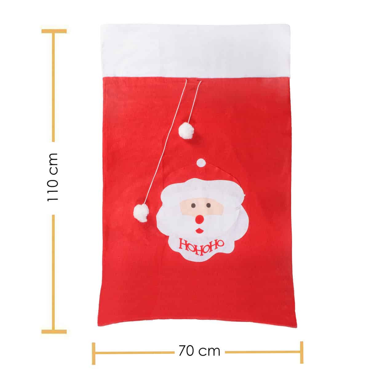 Sac cadouri Mos Craciun realizat din fleece cu ciucuri albi, dimensiune 70x110cm. Inaltimea totala: aproximativ 110 cm Latimea totala: aproximativ 70 cm