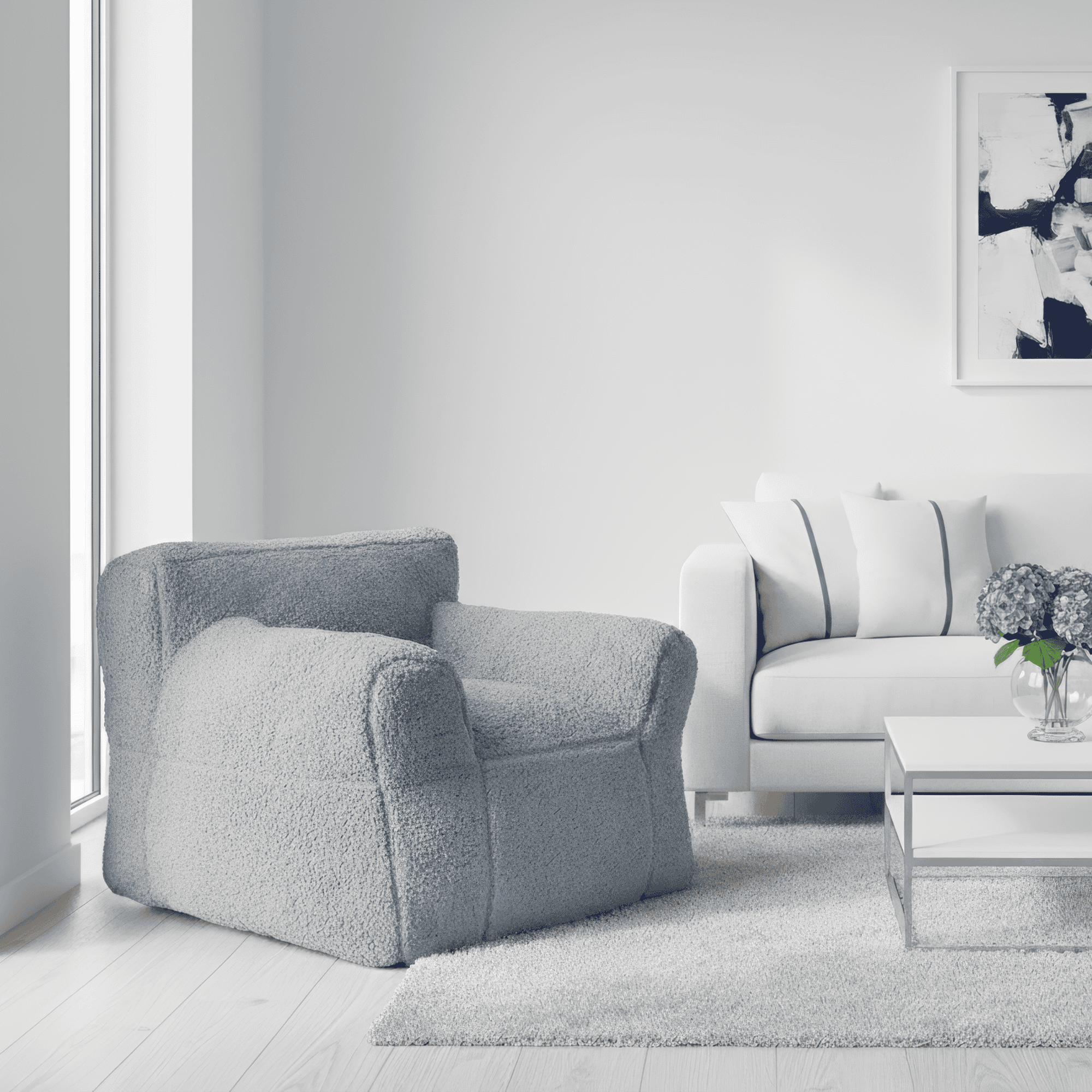 Material: ţesătură Bouclé/spumă de compresie Rezistenţa ţesăturii la frecare conform testului Martindale: 45 000 de cicluri de frecare Culoare: gri deschis Dimensiuni (lxAxh): 74x72x54 cm Mâner practic pe spate Material plăcut Umplutura este non-toxică Întreţinere uşoară Curăţare cu apă cu săpun cu ph scăzut Vă recomandăm să deschideţi spuma şi să o lăsaţi să-şi atingă volumul timp de 24 de ore Capacitate de transport: 90 kg