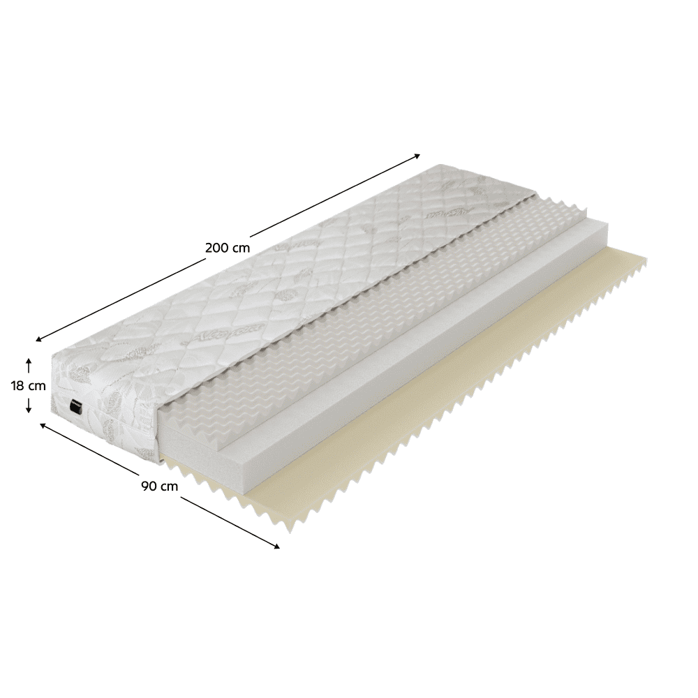 Material: spumă rece, spumă poliuretanică/spumă elastică/husă Dimensiuni (Lxl): alb Culoare design: 90×200 cm Înălţimea saltelei: 18 cm Portanţă per persoană: 110 kg Duritate saltea H3 Husă cu două feţe din extracte de Aloe Vera Husă cu certificat OEKO-TEX STANDARD Cu fermoar de jur împrejur Detaşabilă Se poate spăla la o temperatură de până la 40 °C Recomandăm grilă cu lamele Număr minim de lamele 28 Distanţă între lamele max. 6 cm