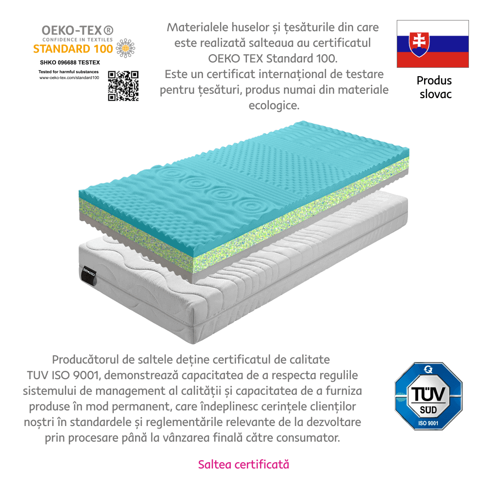 Saltea cu şapte zone de tip sandvici cu placă RE cu o grosime de 7 cm cu dimensiuni de la 80×200 cm la 180×200 cm. Straturile exterioare sunt realizate din spumă PUR de înaltă calitate. Salteaua are un punct central puternic consolidat. Are o rezistenţă ridicată, o capacitate crescută de încărcare şi o profilare anatomică. Husa este fabricată din material textil CHLOE AKTIV de înaltă calitate şi este detaşabilă. Înălţimea saltelei este de 14 cm. Vă recomandăm să cumpăraţi un grilaj fix sau reglabil pentru saltea. Capacitate de încărcare: 110 kg.