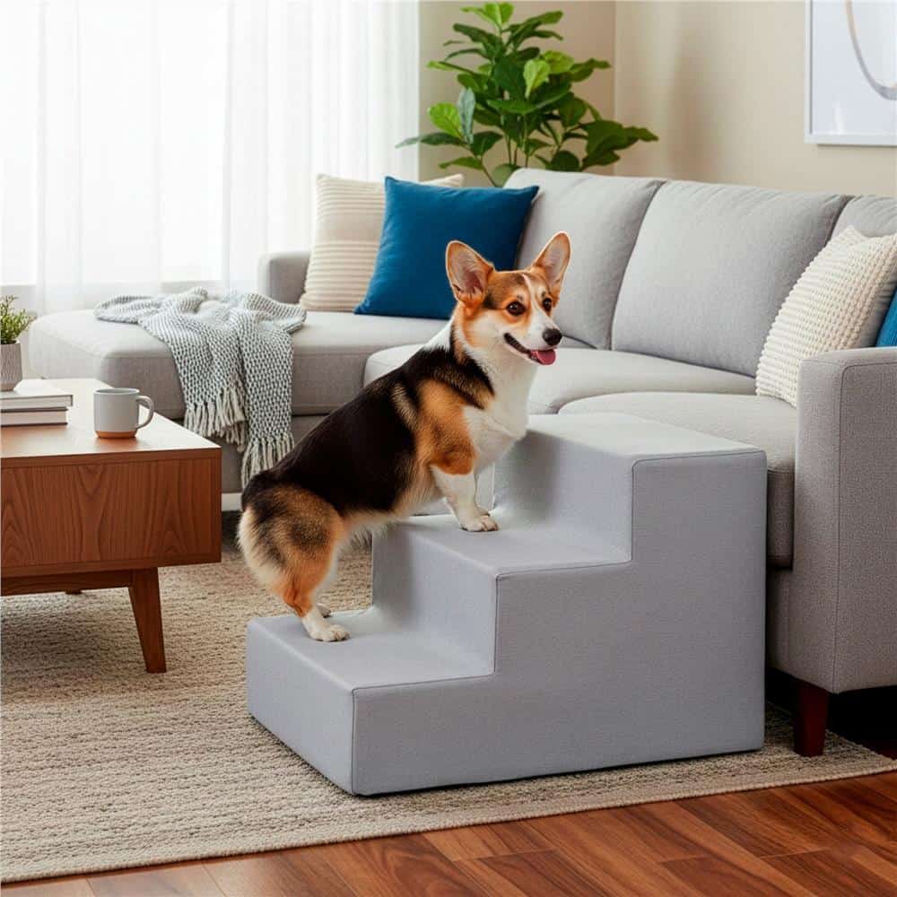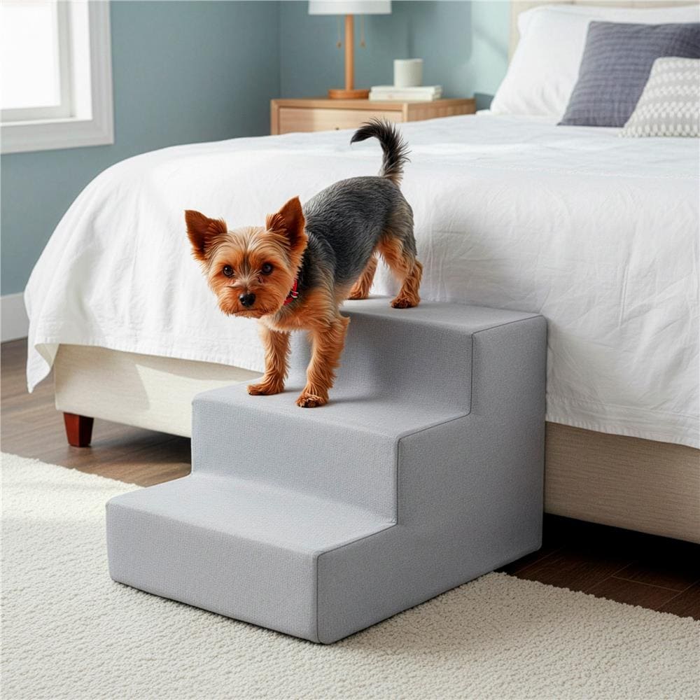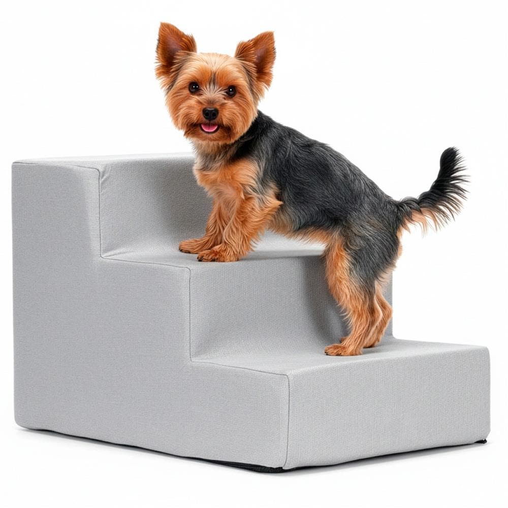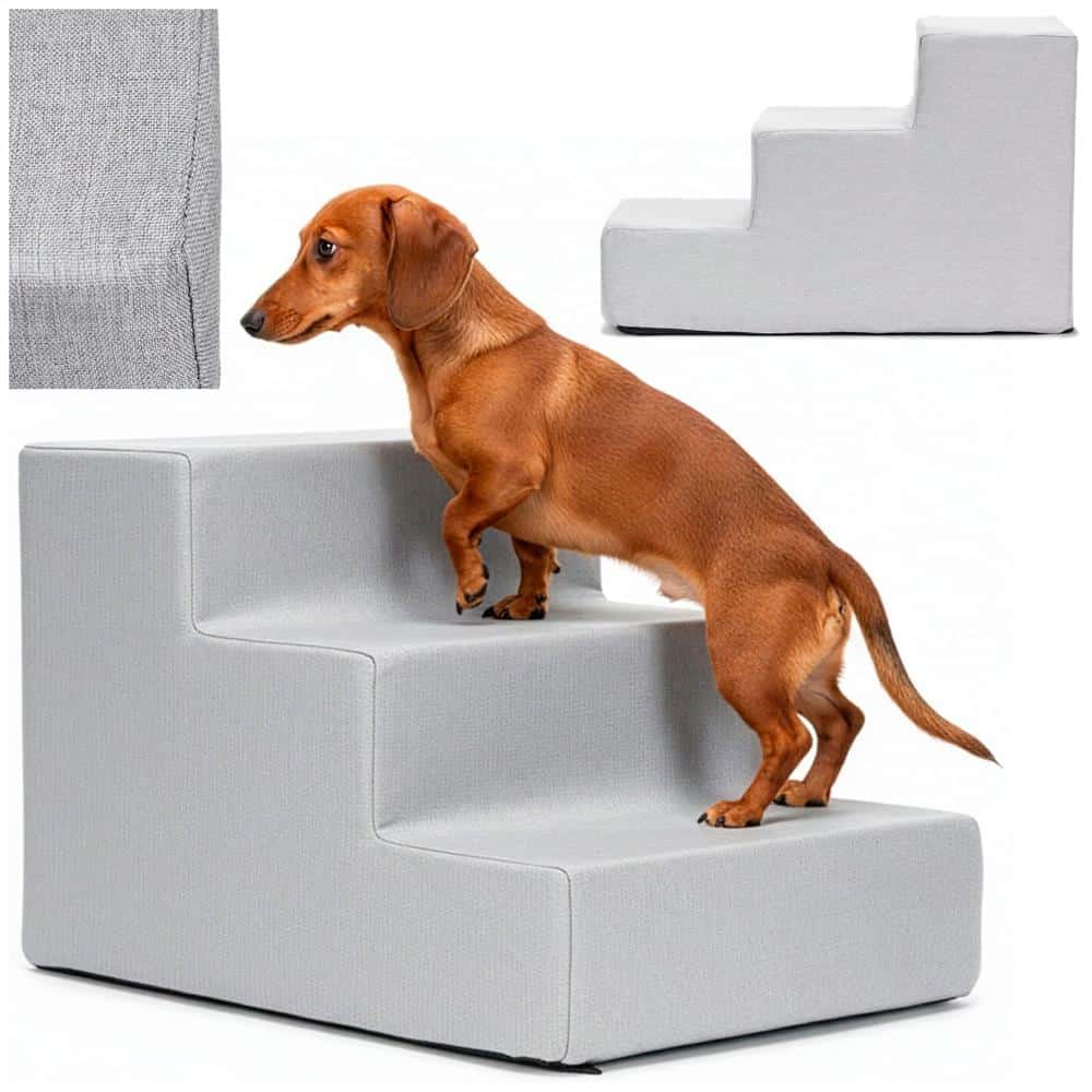Scara pentru animale de companie, caini sau pisici, 3 trepte, antiderapanta, husa detasabila, inaltime 30 cm, gri deschis Mob360