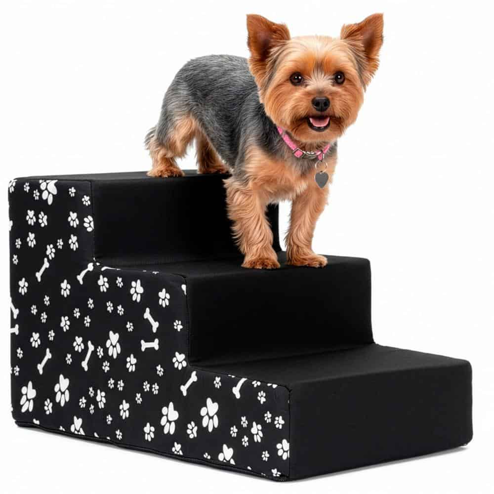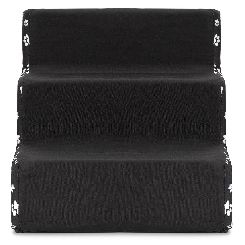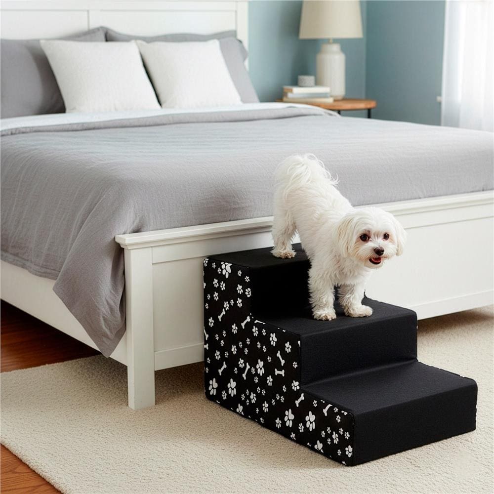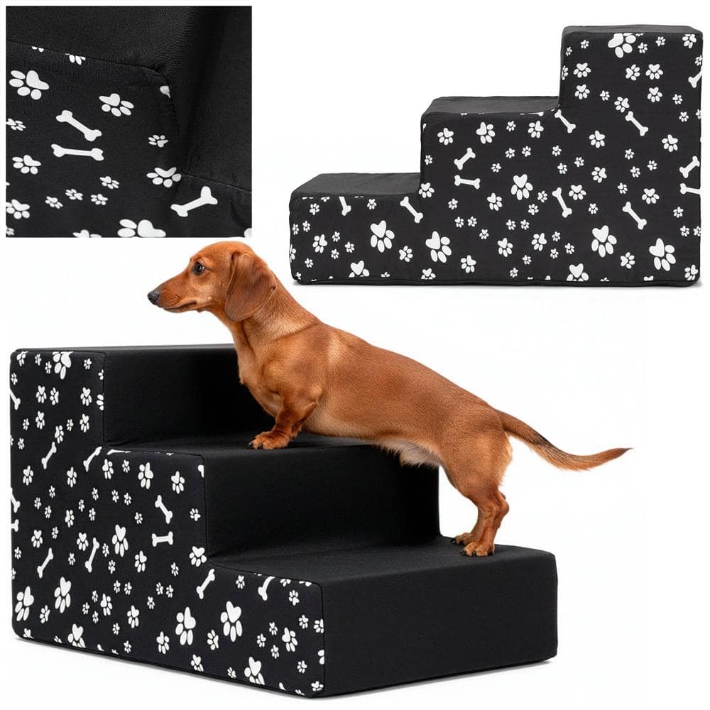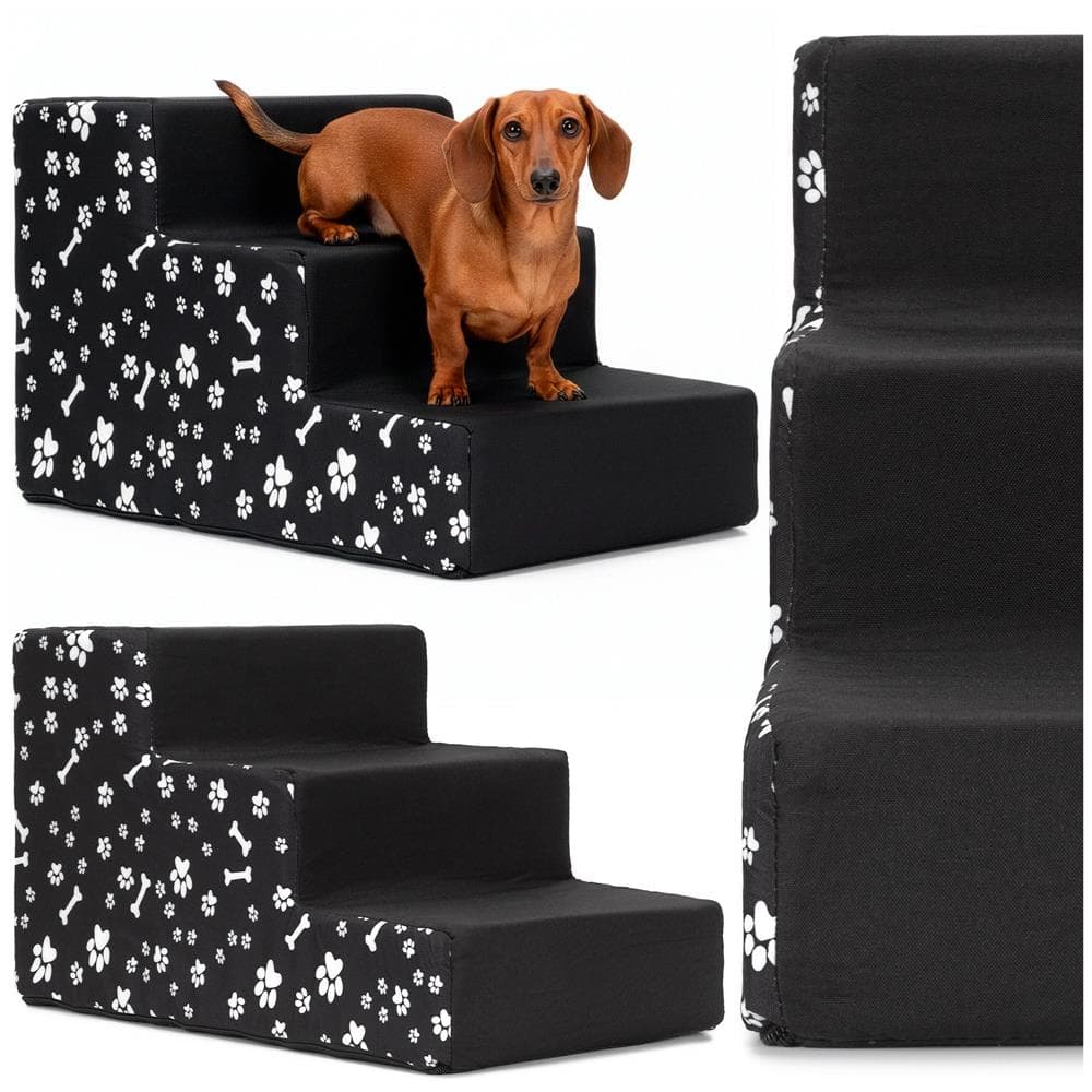 Scara pentru animale de companie, caini sau pisici, 3 trepte, antiderapanta, husa detasabila, inaltime 30 cm, negru cu decor alb Mob360