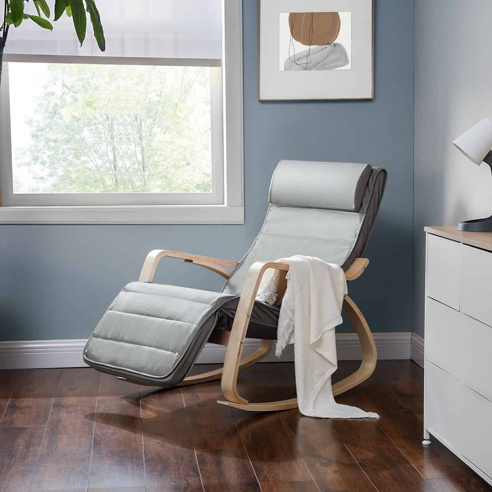 Scaun balansoar din lemn, suport picioare reglabil, maxim 150kg, 67x115x91cm, gri deschis Mob360 – produs disponibil în magazinul Mob360.