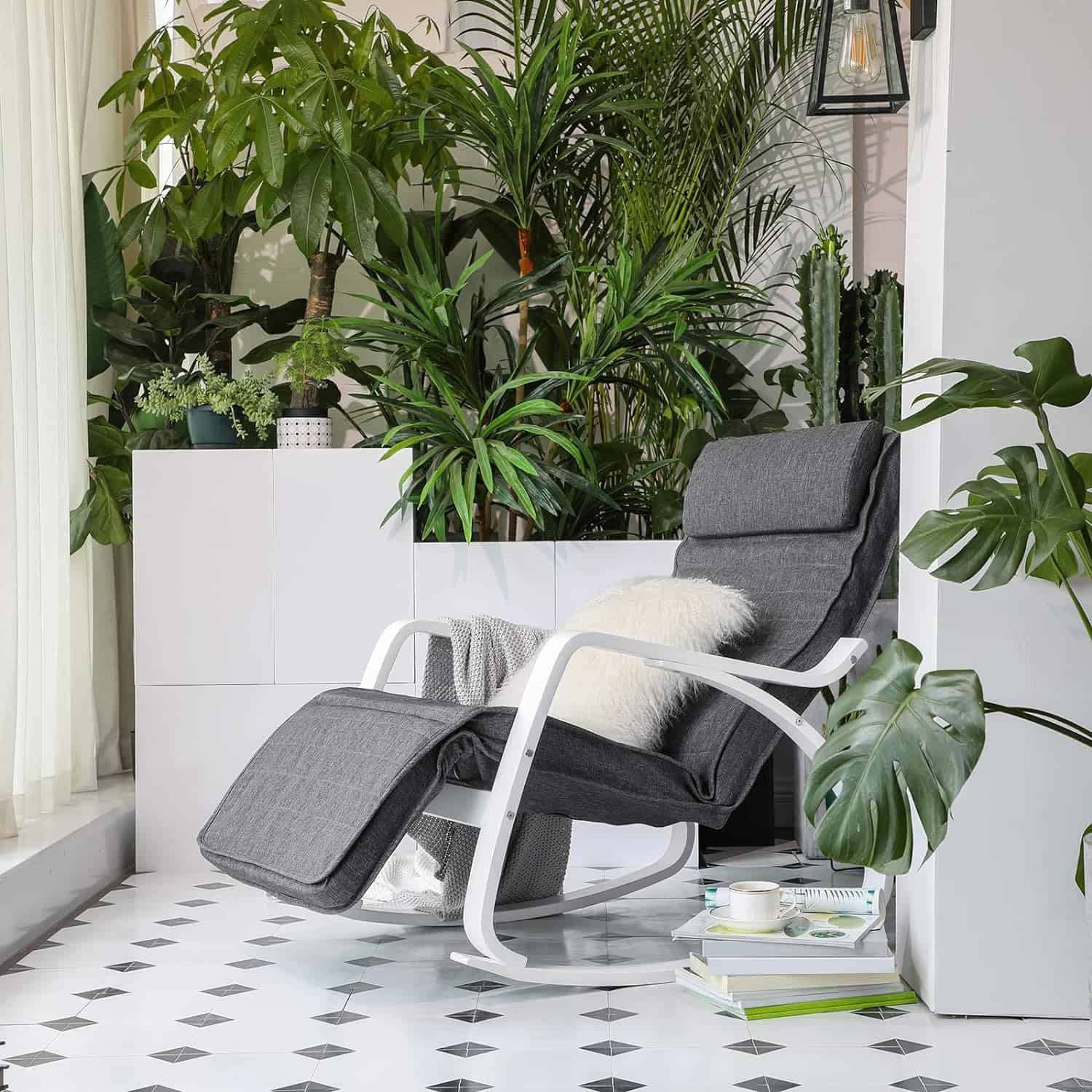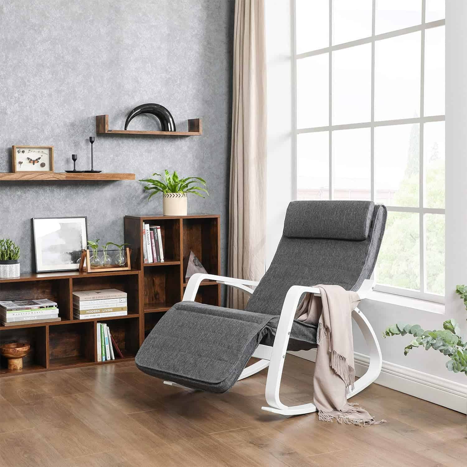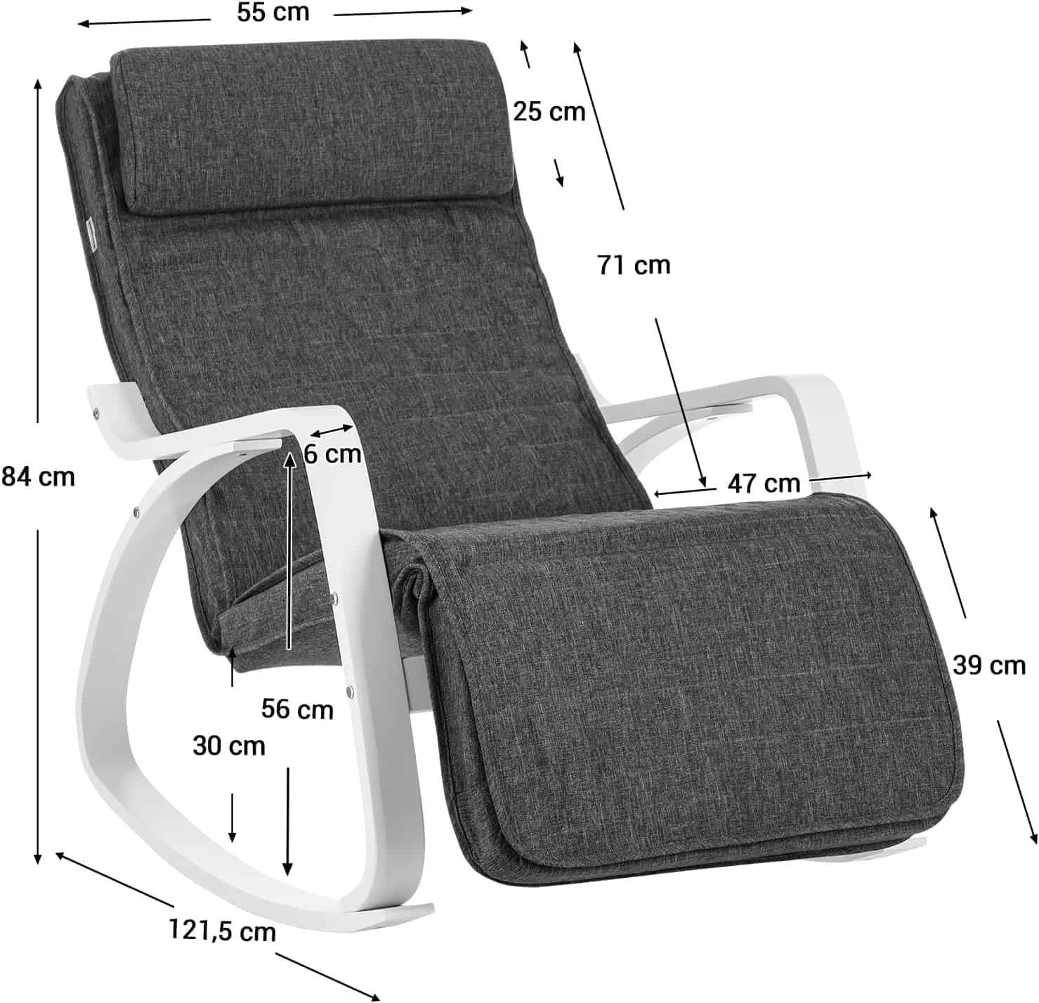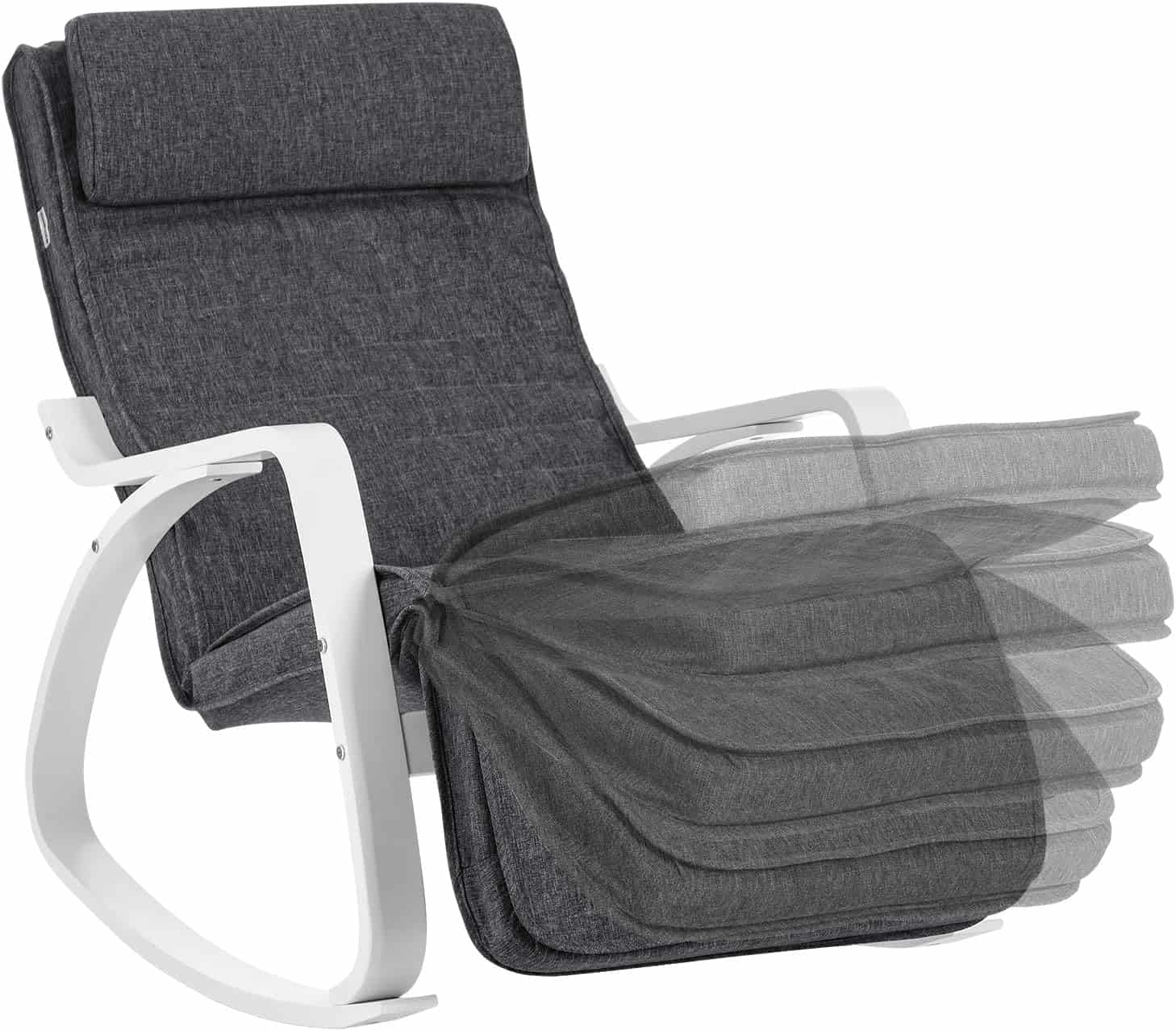 Marca: SONGMICS Culoare: Gri inchis + alb Dimensiuni produs: 121,5D x 67W x 84H cm Dimensiune: 121,5 x 67 x 84 cm Despre acest articol Fabricat din lemn de mesteacan de inalta calitate si un cadru metalic in interior, acest scaun balansoar este stabil si sigur si poate sustine pana la 150 kg.Suportul pentru picioare al fotoliului culisant este reglabil in 5 pozitii. Fie ca doriti sa va relaxati sau sa cititi o carte, aici puteti gasi o pozitie ideala. Captusite cu spuma foarte elastica, perna scaunului si tetiera sunt moi si confortabile. Puteti trage un pui de somn confortabil pe acest fotoliu. Husa pernei scaunului si a tetierei este usor detasabila pentru curatare. In plus, tetiera poate fi usor indepartata sau atasata datorita inchizatoarelor practice Velcro.Puteti utiliza fotoliul balansoar in dormitor, in camera de zi sau in birou. Picioarele sale sunt, de asemenea, echipate cu pasla antiderapanta, care va protejeaza podeaua.