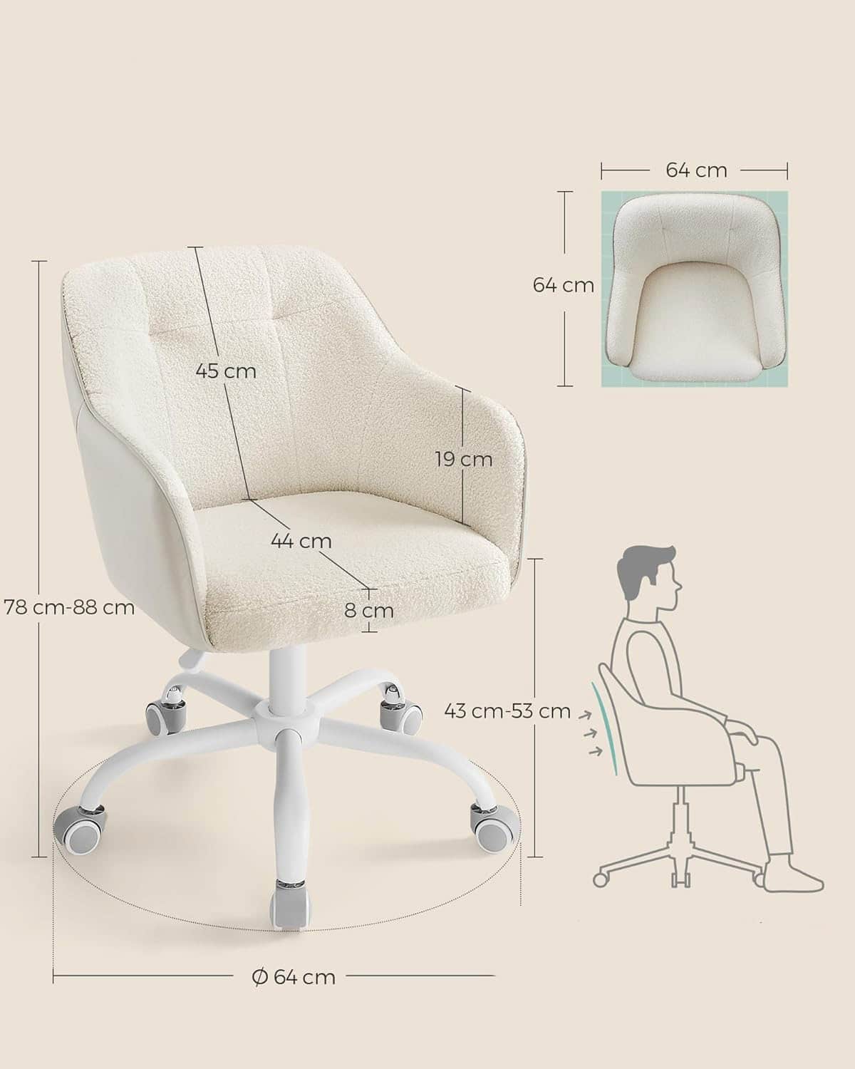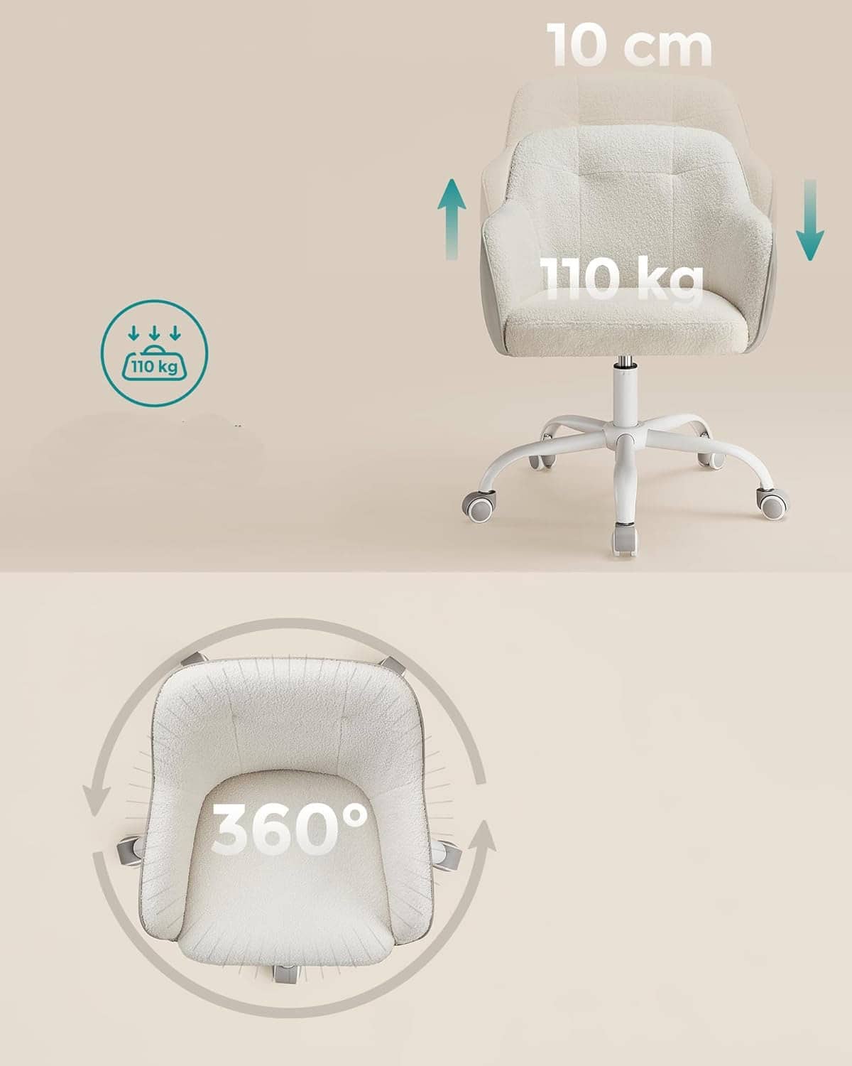 Scaun birou rotativ, reglabil pe inaltime, material sherpa si PU, cadru otel, 64x64x78-88cm, bej Mob360 – produs disponibil în magazinul Mob360.