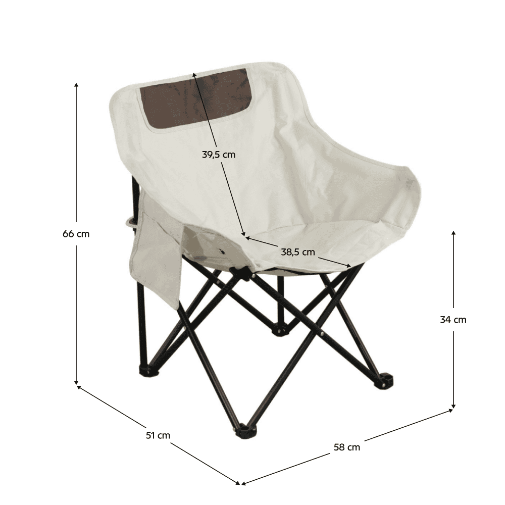 Material: ţesătură / metal Culoare: bej / neagră Dimensiuni scaun / pliat (LxAxÎ): 16x16x65 cm Dimensiuni scaun / desfăşurat (LxAxÎ): 58x51x66 cm Înălţimea zonei pentru şezut: 34 cm Adâncimea zonei pentru şezut: 38,5 cm Capacitate de susţinere a scaunului: 90 kg Greutate: 2,55 kg Furnizat cu o husă de transport Furnizat cu capace din plastic Uşor şi practic Pliabil Portabil Uşor de manevrat şi depozitat Potrivit pentru utilizare în exterior Pentru vacanţă, excursie cu maşina, cu cortul, grătar, festivaluri, camping, picnic, plajă, pescuit, grădină, bucătărie de vară Furnizat dezasamblat