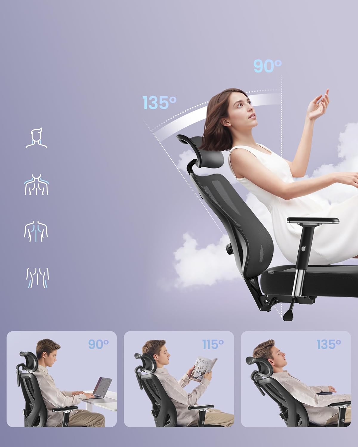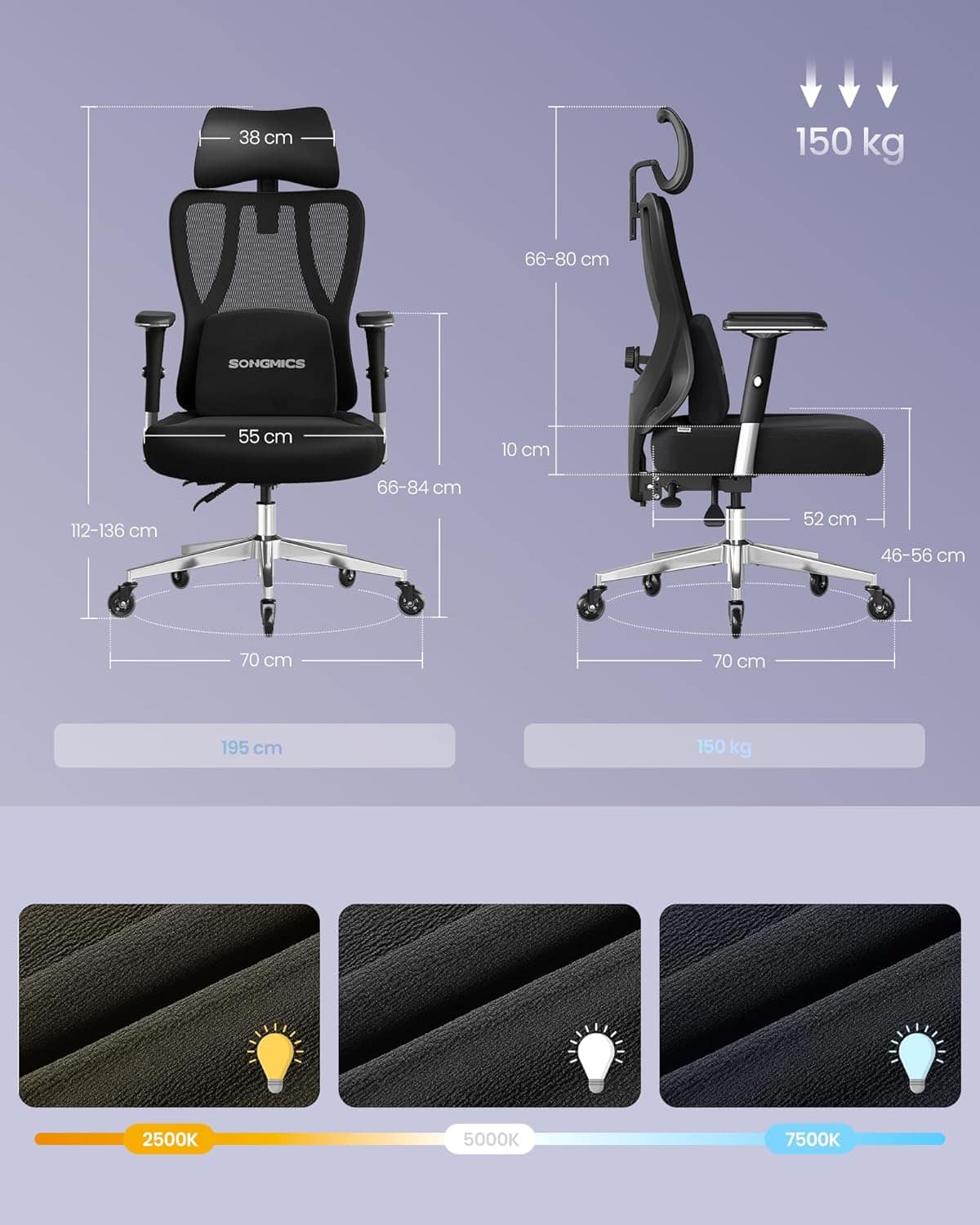 Scaun de birou ergonomic profesional, suport lombar reglabil, tetiera 2D, brate 4D, maxim 150 kg, 70x70x136 cm, negru Mob360