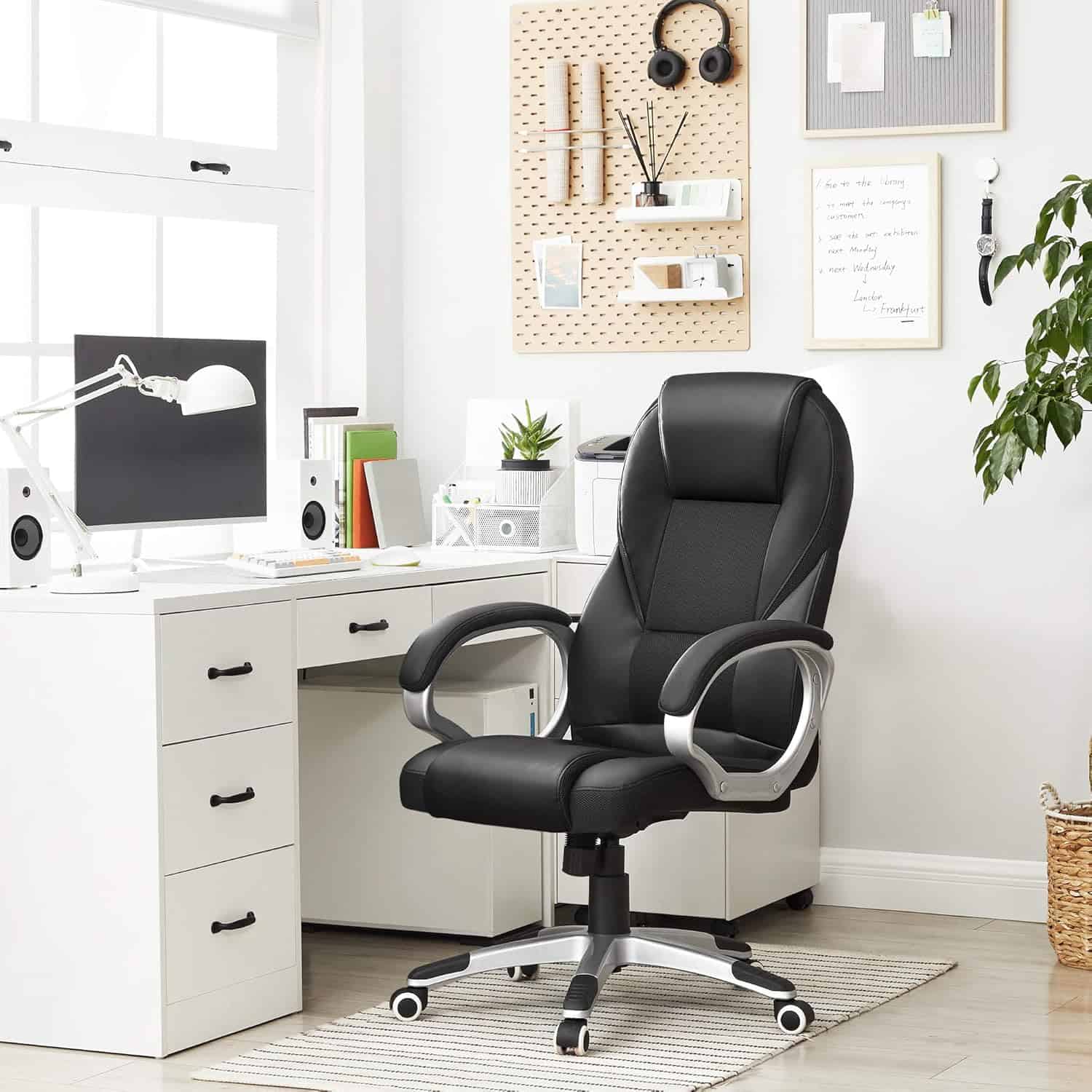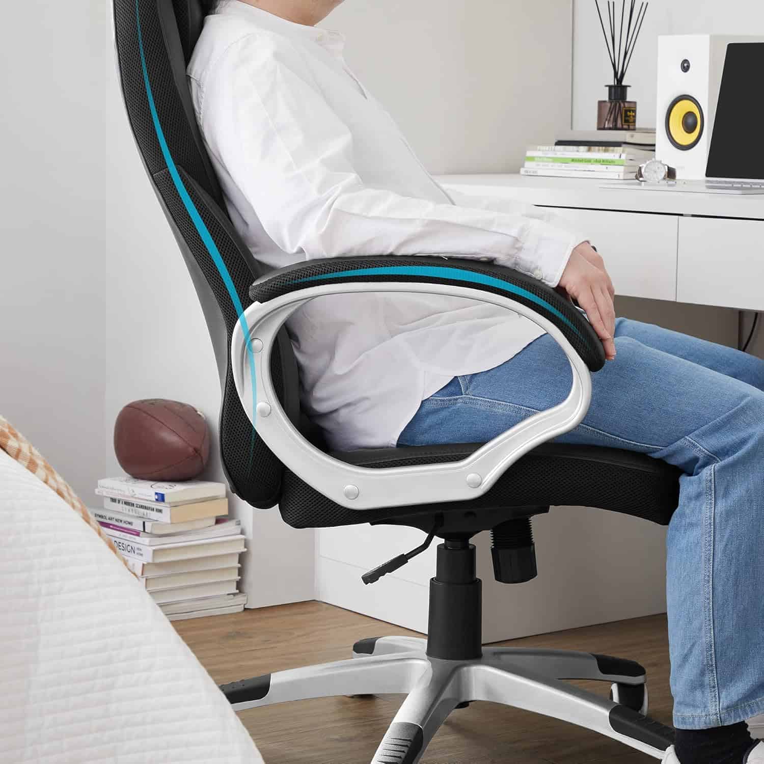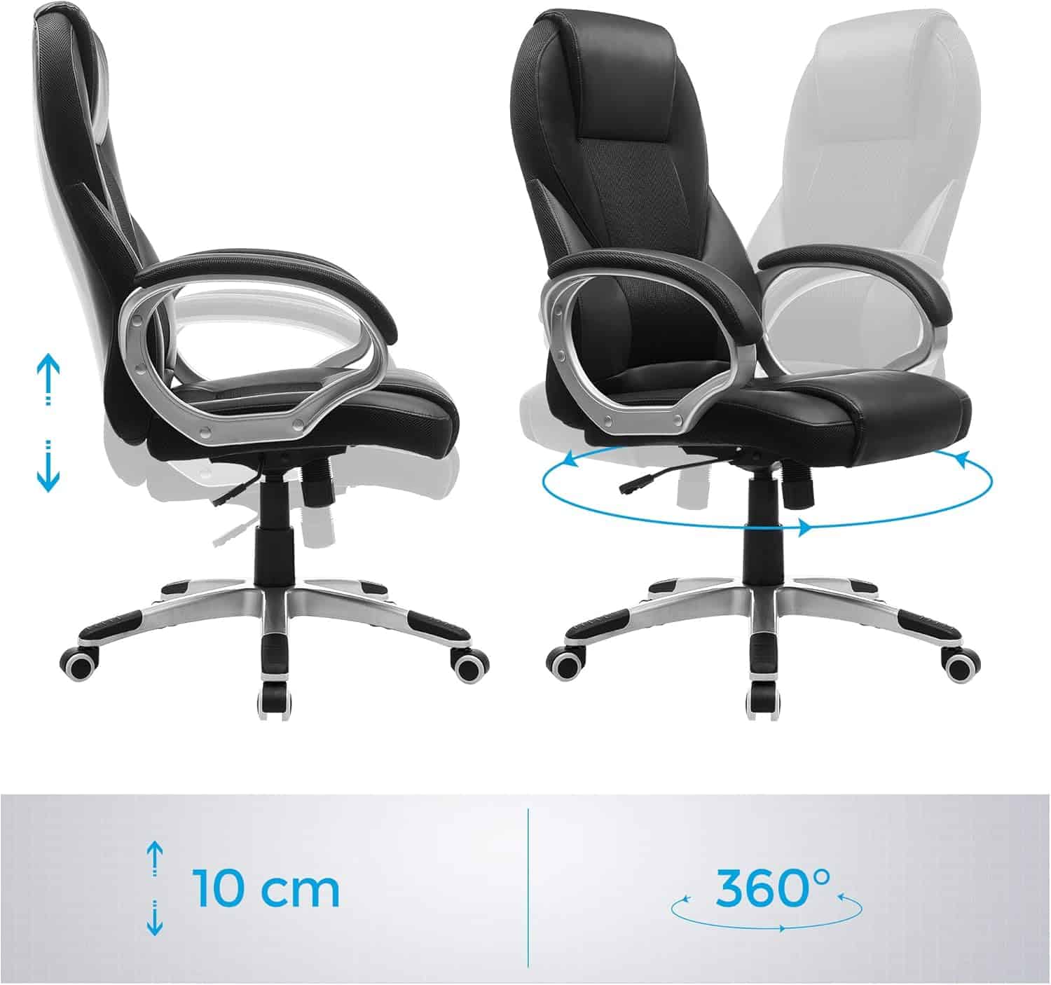 - Scaunul de birou SONGMICS este conceput pentru confort si sustinere pe durata intregii zile. Designul ergonomic se adapteaza formei corpului, reducand tensiunea din zona spatelui si a umerilor. Ideal pentru lucru sau relaxare, ofera stabilitate si confort in orice moment. Caracteristici principale: