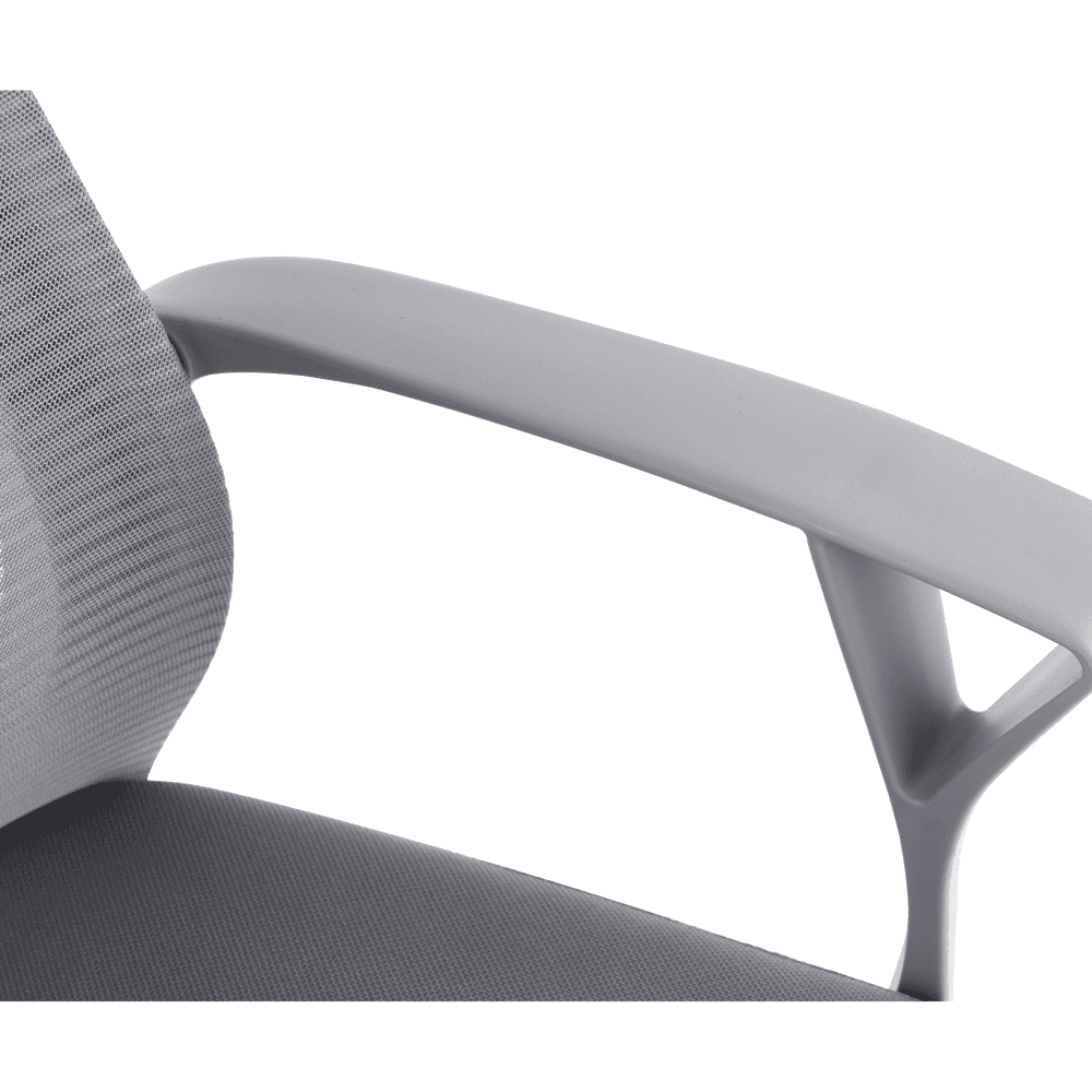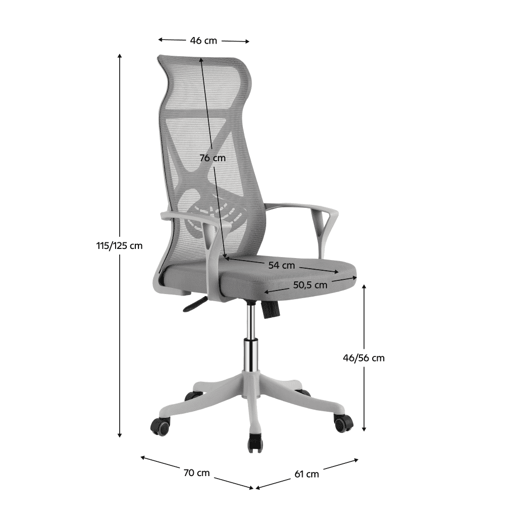 Material tapiţerie: plasă / material textil / plastic Rezistenţa plasei conform testului Martindale: 90.000 de cicluri de frecare Rezistenţa ţesăturii conform testului Martindale: 85.000 de cicluri de frecare Culoare: gri Dimensiuni (LxAxÎ): 61x70x115-125 cm Înălţime scaun: 46-56 cm Lăţime scaun: 50,5 cm Adâncime scaun: 54 cm Înălţime spătar: 76 cm Lăţime spătar: 46 cm Capacitate de încărcare: 110 kg Spătar ergonomic Rotile universale potrivite atât pentru pardoselile moi, cât şi pentru cele dure Mecanism de balansare Înălţime reglabilă a scaunului Livrat dezasamblat