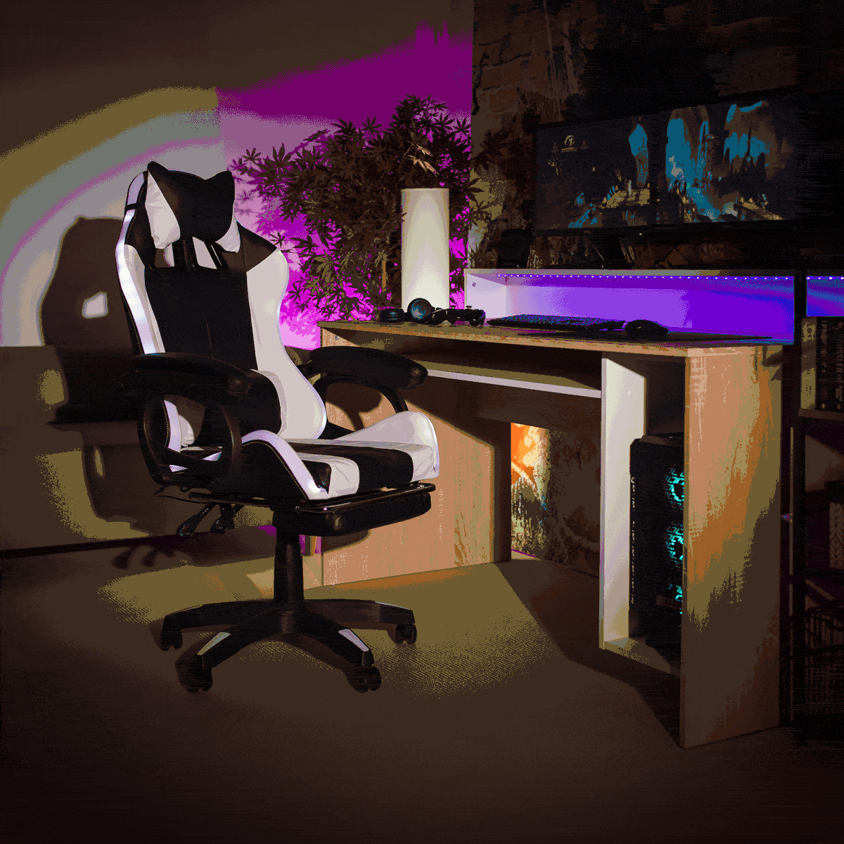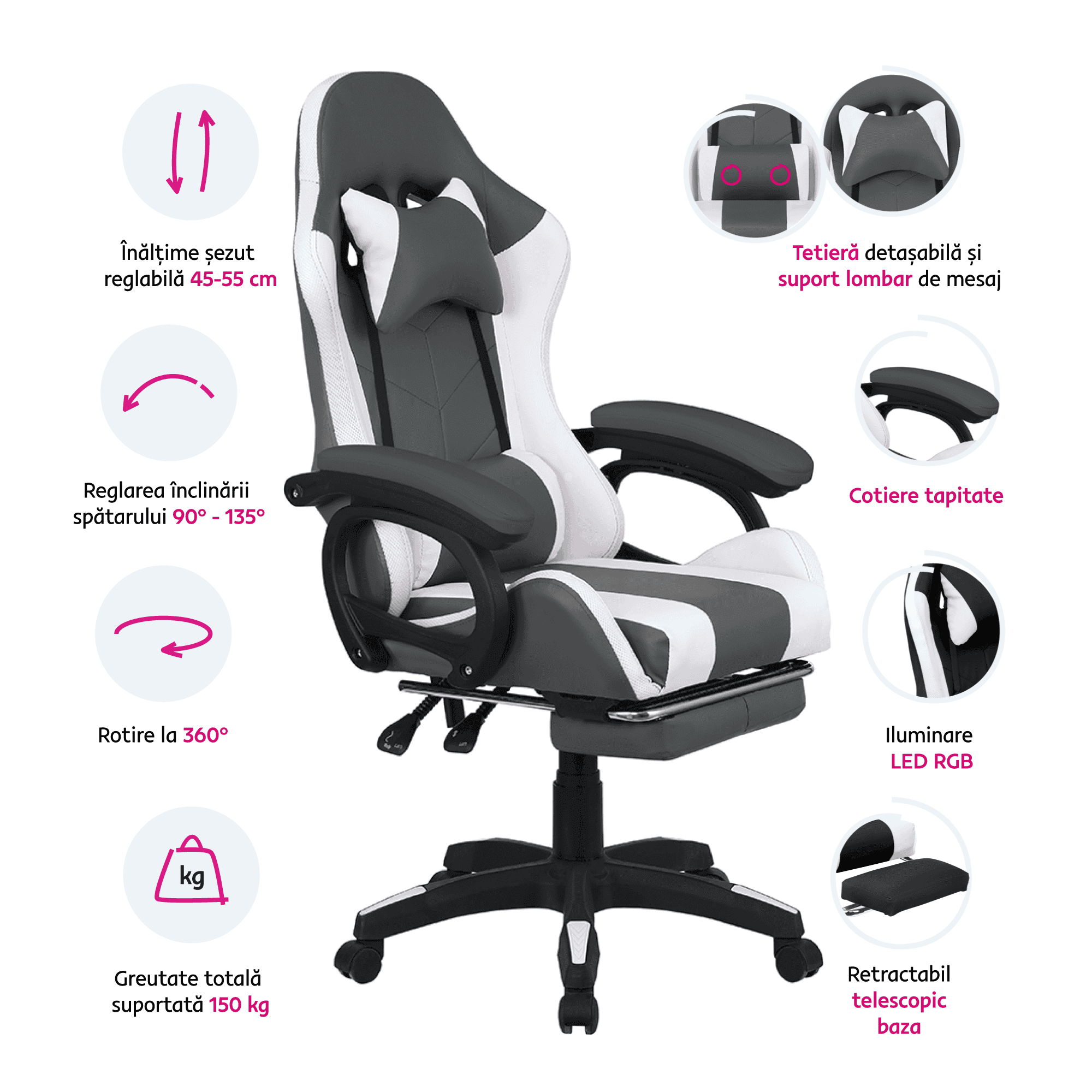 Scaun de birou/joc cu iluminare LED RGB, negru/alb, JOVELA