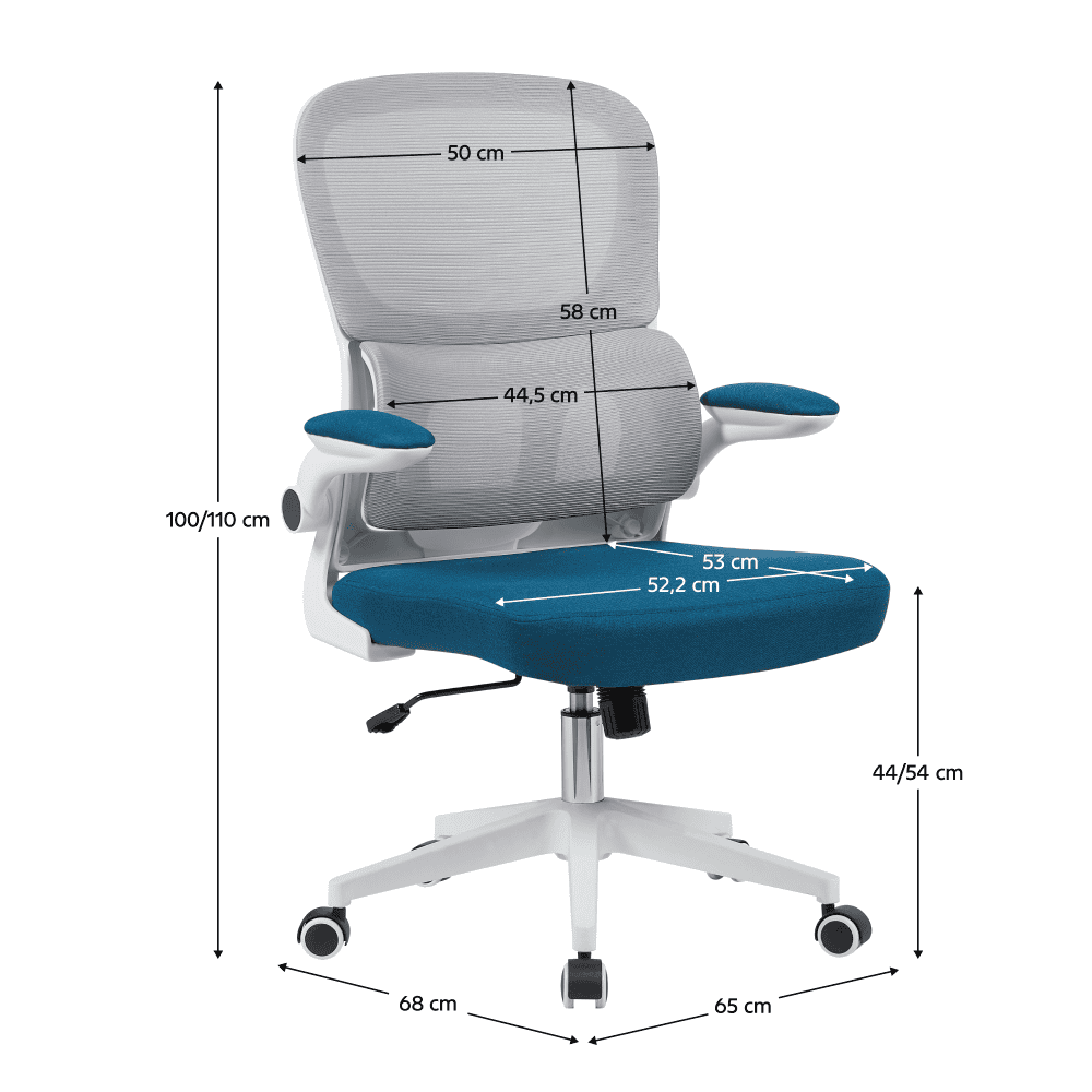 Material: plasă / material textil / plastic Rezistenţa plasei conform testului Martindale: 90.000 de cicluri de frecare Rezistenţa ţesăturii conform testului Martindale: 85 000 de cicluri de frecare Culoare: maro/petrol/alb Dimensiuni (LxAxÎ): 65x68x100-110 cm Înălţimea scaunului: 44-54 cm Adâncime scaun: 53 cm Lăţime scaun: 52,2 cm Înălţime spătar: 58 cm Lăţime spătar: 44,5/50 cm Capacitate de încărcare: 110 kg Cotiere tapiţate şi rabatabile Înălţime reglabilă a scaunului Baza din plastic cu cinci spiţe Rotile universale Potrivit atât pentru pardoselile dure, cât şi pentru cele moi Mecanism de balansare Livrat dezasamblat
