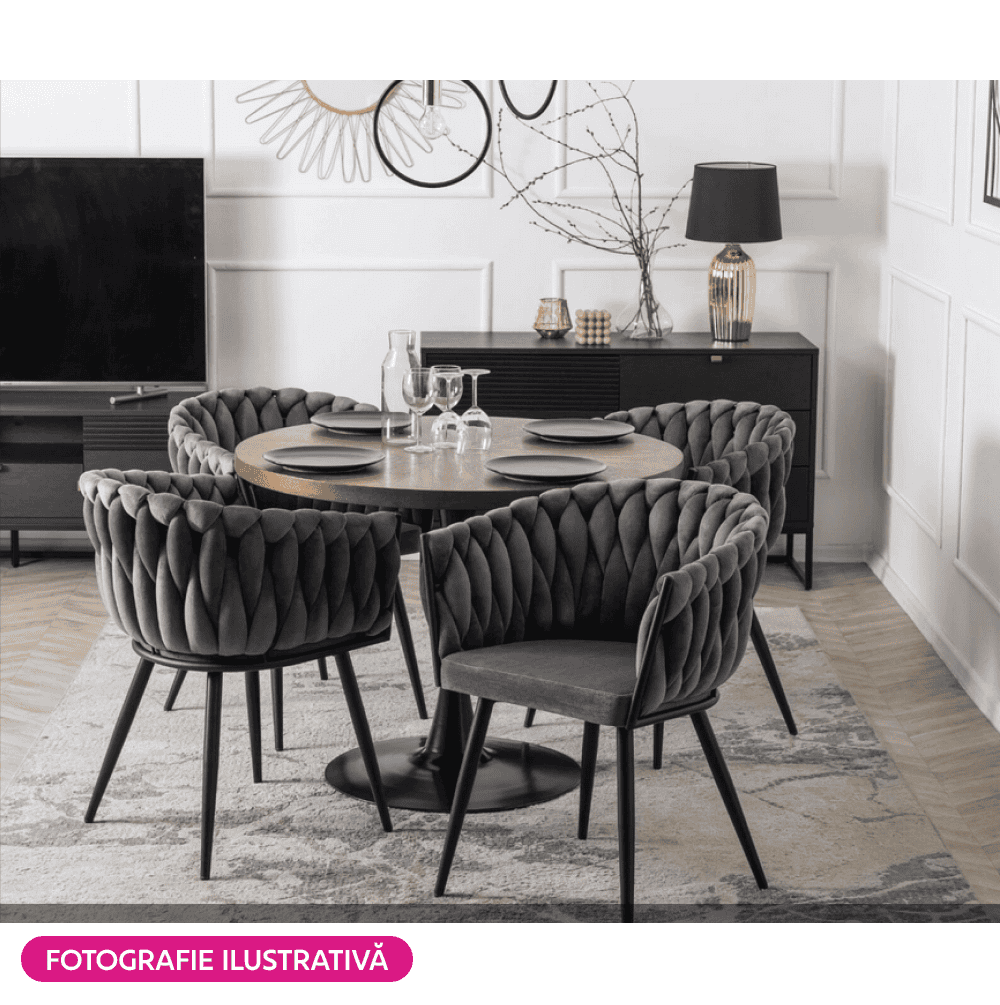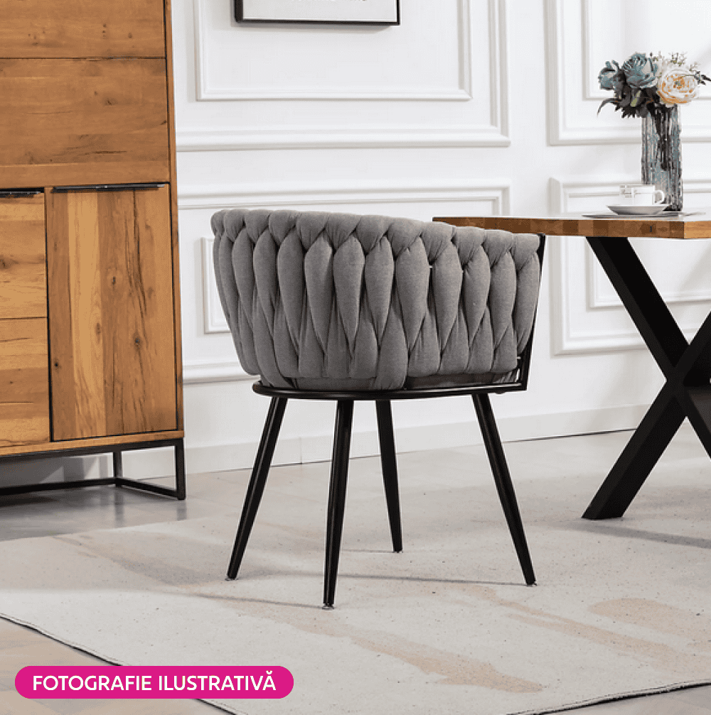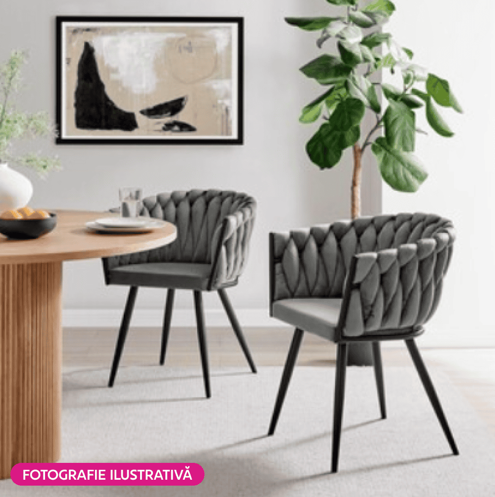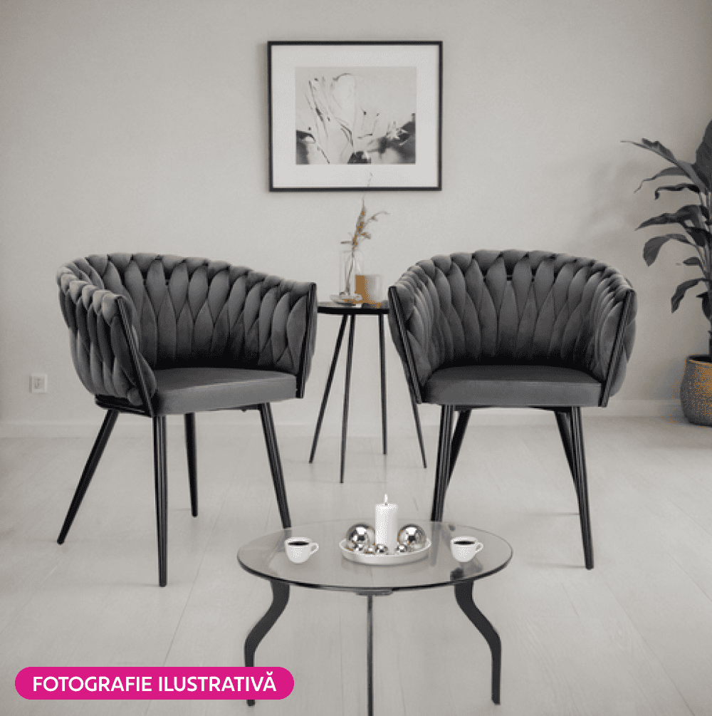Material: ţesătură Velvet metal Rezistenţa ţesăturii la frecare conform testului Martindale: 80 000 de cicluri de frecare Culoare: gri închis / albă Dimensiuni (lxAxh): 64x55x78 cm Înălţimea părţii de şezut: 48 cm Adâncimea părţii de şezut: 41 cm Lăţime scaun: 46 cm Lăţime spătar: 43 cm Înălţime spătar: 33 cm Portanţă: 100 kg Cadru metalic De design Cusături decorative cu aspect deosebit Livrat dezasamblat