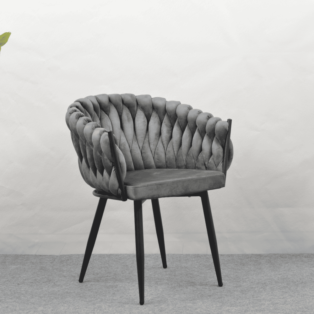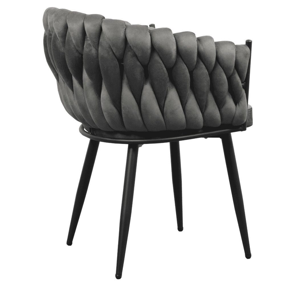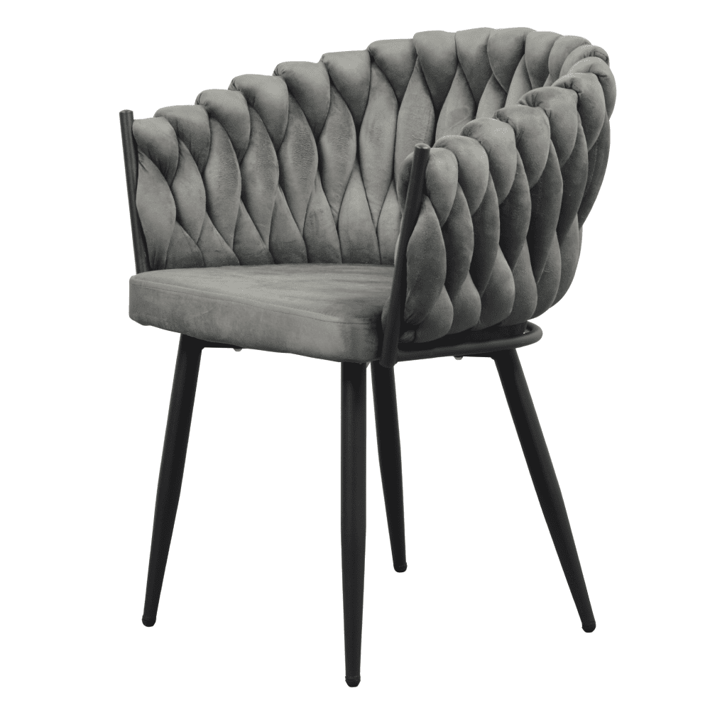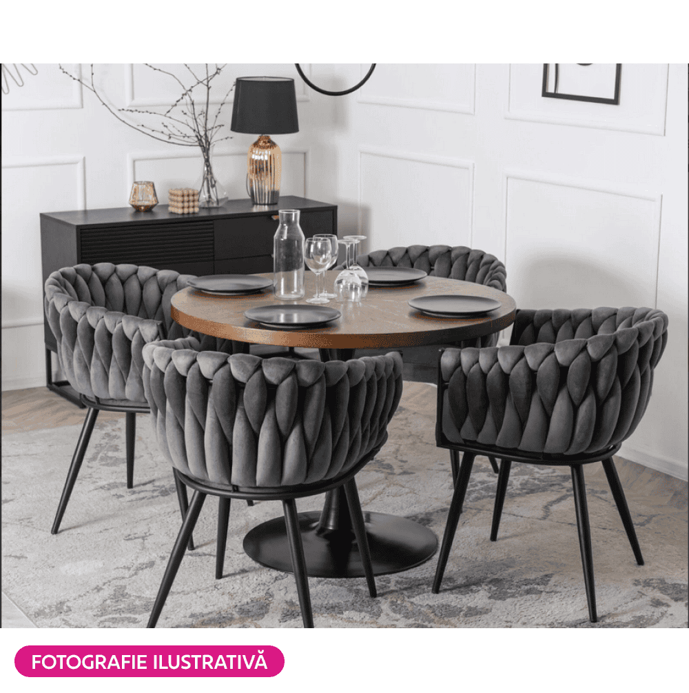 Material: ţesătură Velvet metal Rezistenţa ţesăturii la frecare conform testului Martindale: 80 000 de cicluri de frecare Culoare: gri închis / albă Dimensiuni (lxAxh): 64x55x78 cm Înălţimea părţii de şezut: 48 cm Adâncimea părţii de şezut: 41 cm Lăţime scaun: 46 cm Lăţime spătar: 43 cm Înălţime spătar: 33 cm Portanţă: 100 kg Cadru metalic De design Cusături decorative cu aspect deosebit Livrat dezasamblat