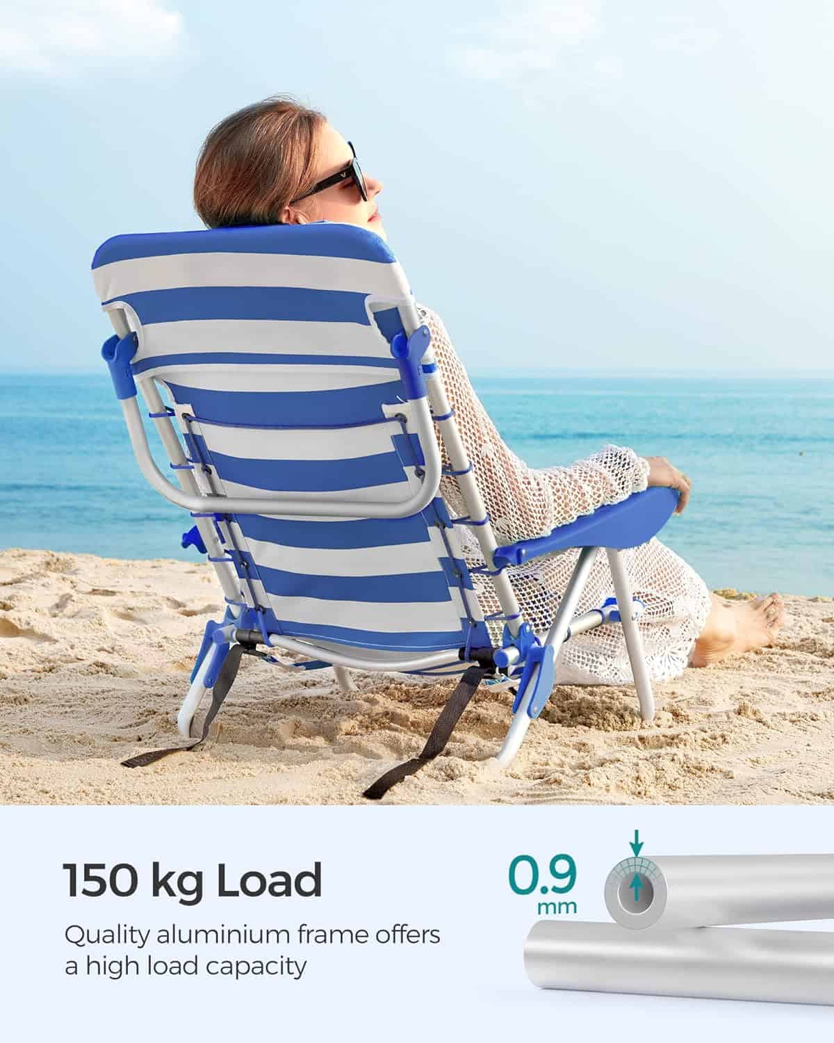 Scaun de plaja portabil cu spatar rabatabil in 4 pozitii, cu cotiere, maxim 150kg, alb albastru Mob360