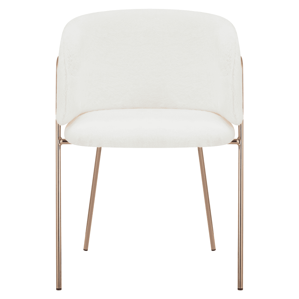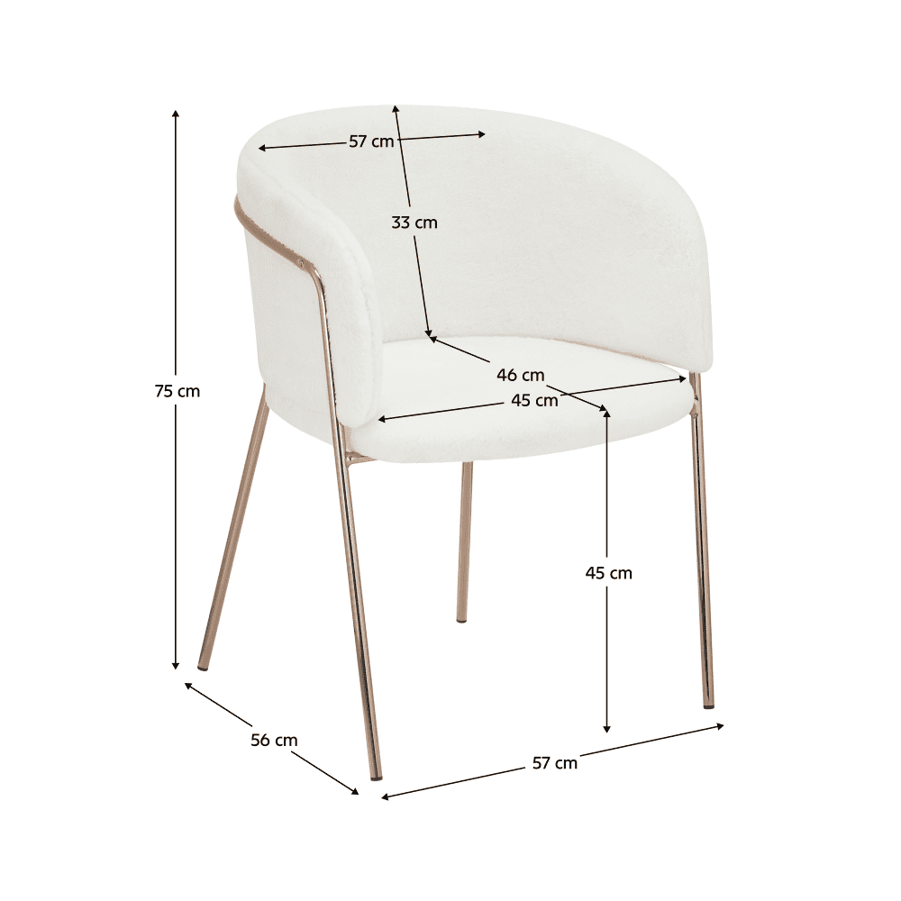 Material: blană artificială/crom Rezistenţa la frecare a blănii conform testului Martindale: 70 000 de frecări Culoare: alb fildeş/rose gold crom roz Dimensiuni (Lxlxh): 57x56x75 cm Înălţimea scaunului: 45 cm Adâncime scaun: 46 cm Lăţime scaun: 45 cm Înălţime spătar: 33 cm Lăţime spătar: 57 cm Portanţă: 100 kg Construcţie metalică De design Livrat dezasamblat