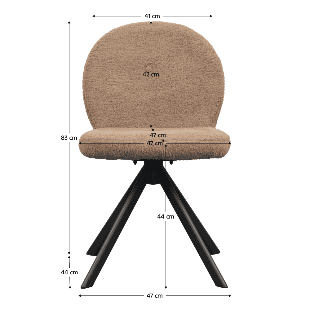 Material: ţesătură Bouclé/metal Rezistenţa ţesăturii la frecare conform testului Martindale: 45.000 de cicluri de frecare Culoare: maro deschis/neagră Dimensiuni colţar (lxAxh): 47x44x83 cm Înălţimea părţii de şezut: 44 cm Lăţimea părţii de şezut: 47 cm Adâncimea părţii de şezut: 47 cm Înălţime spătar: 42 cm Lăţime spătar: 41 cm Portanţă: 100 kg Greutate: 6,2 kg Pivotant De sufragerie De design Livrat asamblat
