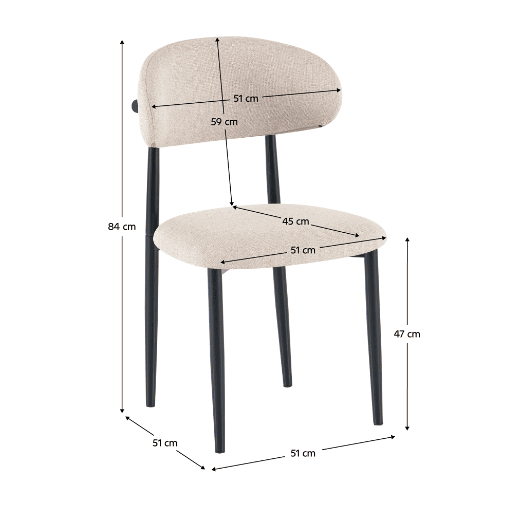Material: ţesătură/metal Rezistenţa ţesăturii la frecare conform testului Martindale: 80 000 de cicluri de frecare Culoare: bej/neagră Dimensiuni (lxAxh): 51x51x84 cm Înălţimea părţii de şezut: 47 cm Adâncimea părţii de şezut: 45 cm Lăţimea părţii de şezut: 51 cm Lăţime spătar: 51 cm Înălţime spătar: 59 cm De sufragerie De design Portanţă: 100 kg Livrat dezasamblat