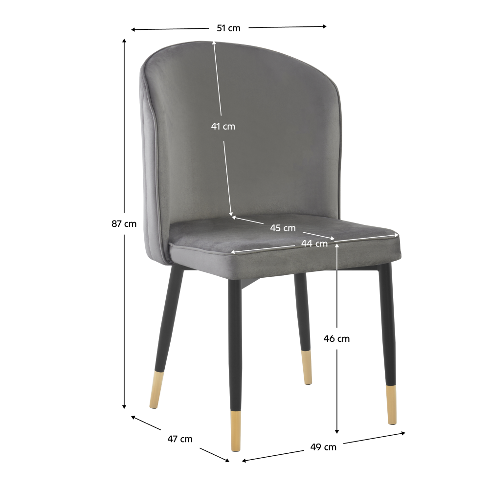 Material: Material: ţesătură/metal Rezistenţa ţesăturii la frecare conform testului Martindale: 85 000 de cicluri de frecare Culoare: gri/neagră/aurie Dimensiuni (lxAxh): 49x47x87 cm Înălţime părţii de şezut: 46 cm Adâncimea părţii de şezut: 45 cm Înălţime spătar: 41 cm Lăţime spătar: 51 cm Spătar rotunjit Decorativ matlasat De sufragerie De design Portanţă: 90 kg Livrat dezasamblat