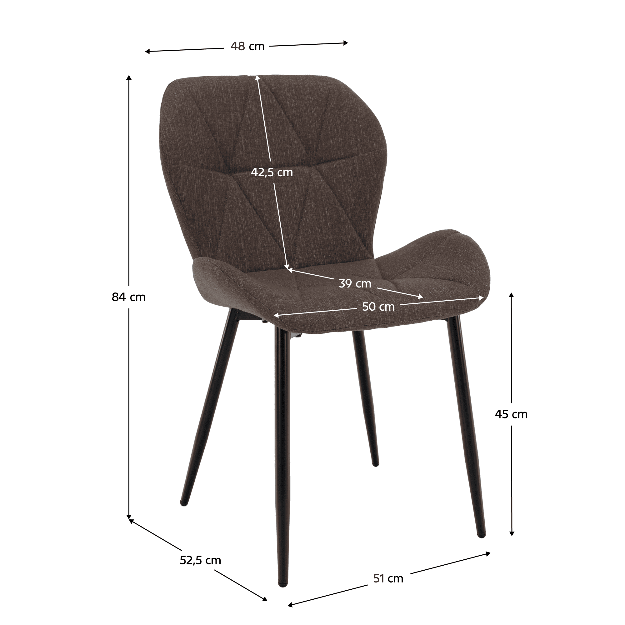 Material: ţesătură / metal Rezistenţa ţesăturii conform testului Martindale: 70.000 de cicluri de frecare Culoare: maro / neagră Dimensiuni (LxAxÎ): 51×52,5×84 cm Înălţime scaun: 45 cm Adâncime scaun: 39 cm Lăţime scaun: 50 cm Înălţime spătar: 42,5 cm Lăţime spătar: 48 cm Capacitate de încărcare: 110 kg Cusături decorative Livrat dezasamblat