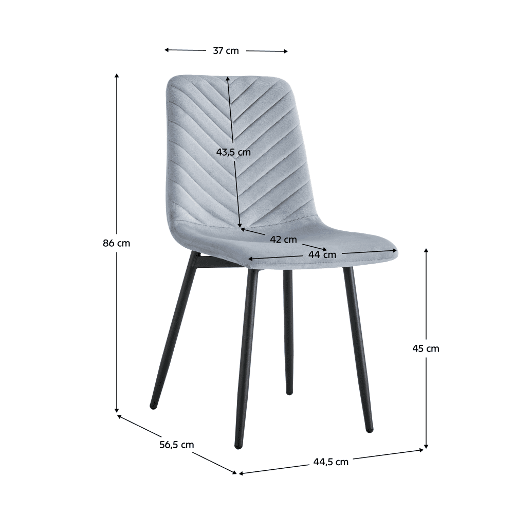 Material: ţesătură Velvet / metal Rezistenţa ţesăturii conform testului Martindale: 80.000 de cicluri de frecare Culoare: gri / neagră Dimensiuni (LxAxÎ): 44,5×56,5×86 cm Înălţimea scaunului: 46 cm Adâncime scaun: 42 cm Lăţime scaun: 44 cm Înălţime spătar: 43,5 cm Lăţime spătar: 37 cm Capacitate de încărcare: 110 kg De design Cusături decorative Livrat dezasamblat