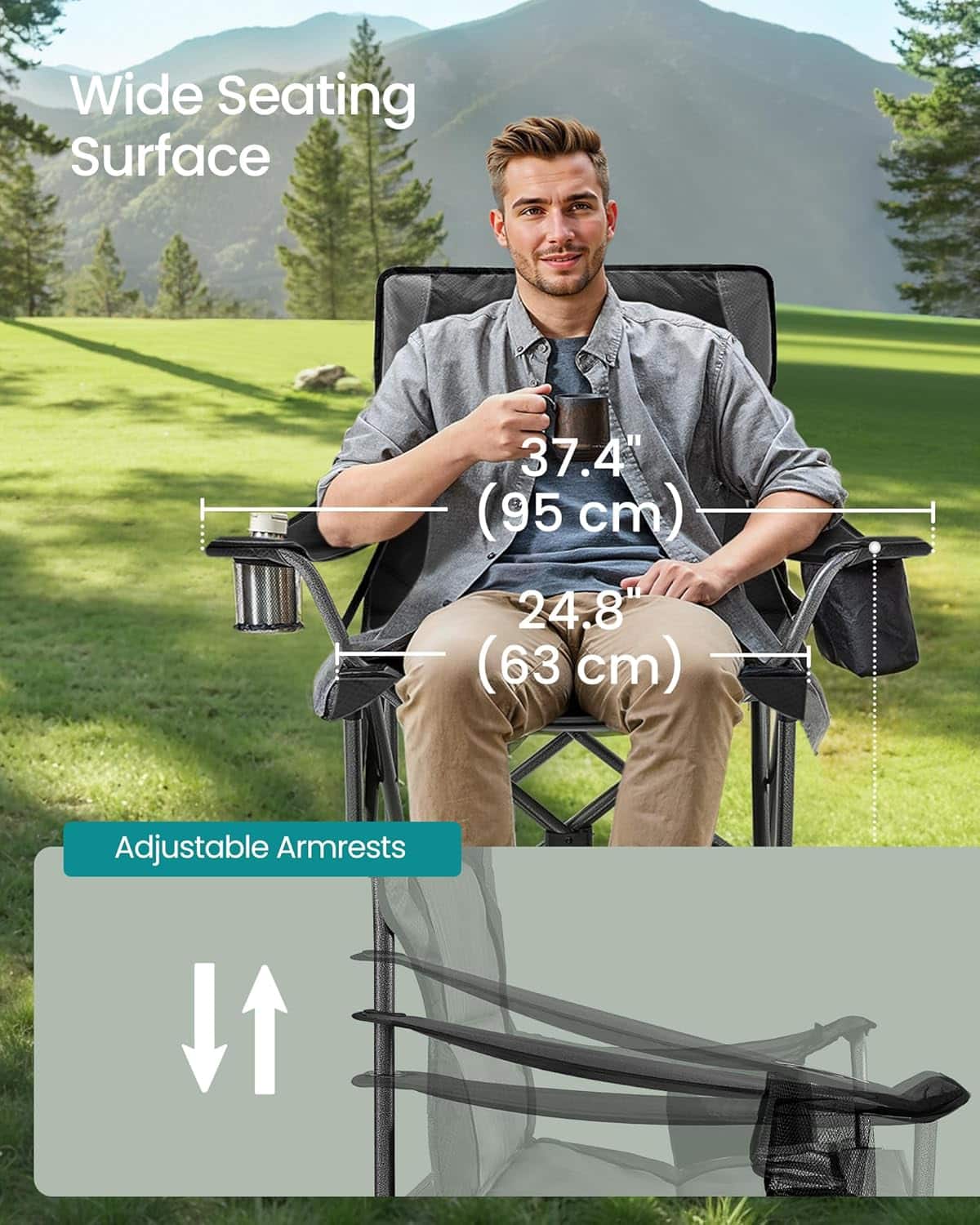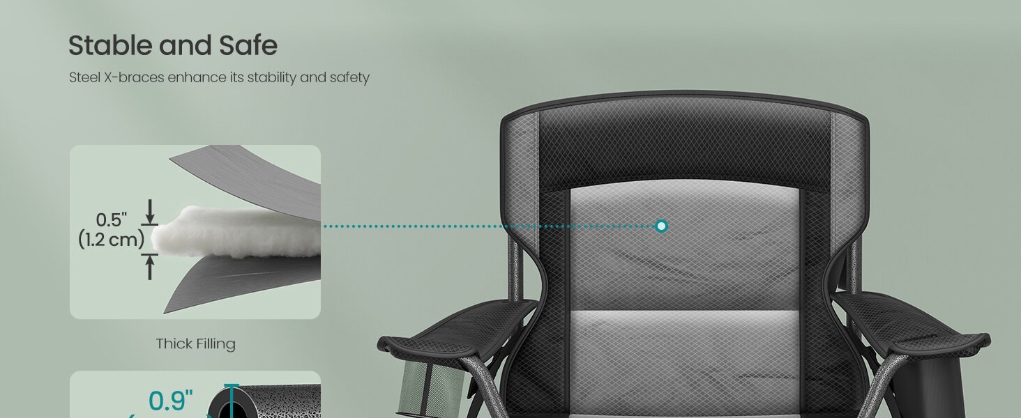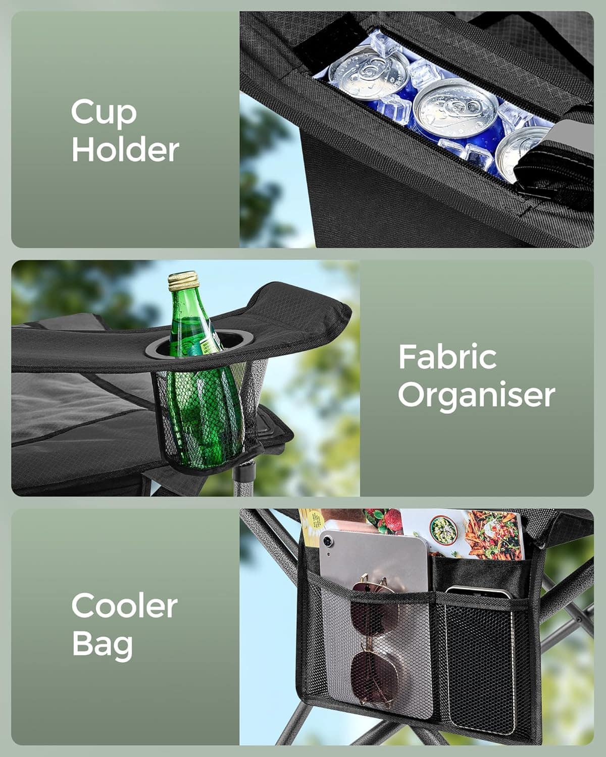 Scaun pliabil camping premium cu spatar inalt si sezut buretat, suport bauturi si buzunar termo, 200 kg, 63x95x100 cm, negru Mob360