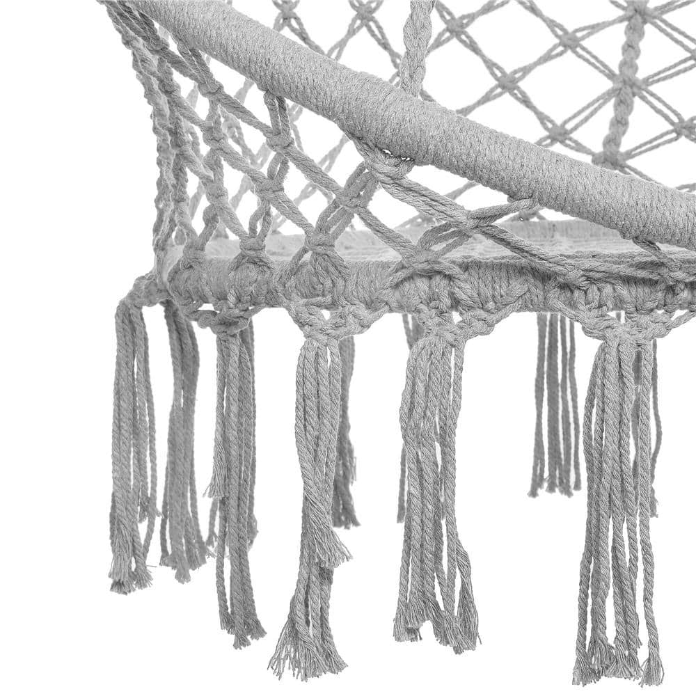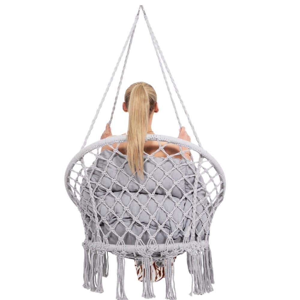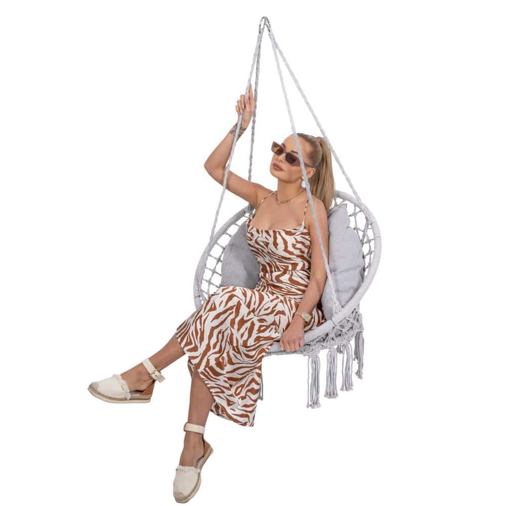 - Fotoliul suspendat cu perna de la este un hit sigur al sezonului. Se potriveste in majoritatea amenajarilor din gradina, de pe terasa, sau din interiorul casei – in camera de zi sau in camera copiilor. Le va oferi copiilor o joaca sigura si plina de distractie, iar adultilor o relaxare fericita. Ciucurii la moda in stil boho, culoarea frumoasa si o impletitura puternica de franghie confera leaganului suspendat un aspect uimitor. Franghiile impletite estetic si cercurile groase legate cu ele ofera rezistenta si confort. Perna moale, de marime potrivita, completeaza perfect ansamblul. Optati pentru un design interesant si faceti relaxarea si mai placuta. Agatati leaganul cuib de barza oriunde doriti. Este o decoratiune geniala pentru interioare – originala, eleganta si in acelasi timp usoara si practica. Va conferi interiorului dvs. un aspect confortabil si neobisnuit. Este o solutie perfecta pentru camerele copiilor, unde mamele pot sa se legene si sa ii hraneasca pe cei mici. Pentru a fi mai usor de agatat, corzile pe care este agatat leaganul sunt finisate cu roti metalice. Puteti agata cu usurinta scaunul in doua moduri. Modul in care doriti sa utilizati leaganul depinde de dumneavoastra!Perna pentru cuibul de barza, a fost realizata cu cea mai mare grija. Culoarea cea mai la moda si tesatura distincta ii adauga farmec si atractivitate. Va va permite sa va odihniti mai confortabil si mai comod. Avantajul sau incontestabil este tesatura din care este confectionata husa pernei – groasa, cu o tesatura distincta. Bumbacul, o fibra naturala care este non-alergenica si confera un aspect rafinat, este un mare avantaj al husei. Este completarea perfecta a leaganului.Inclus: perna pentru scaun