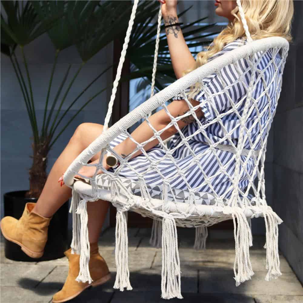 - Leagan modern cu franjuri ce se potriveste perfect atat in casa cat si in gradina. Datorita spatarului confortabil, va bucura de relaxarea oferita dupa o zi grea.Greutatea maxima admisa este de 150kg. Caracteristici:-