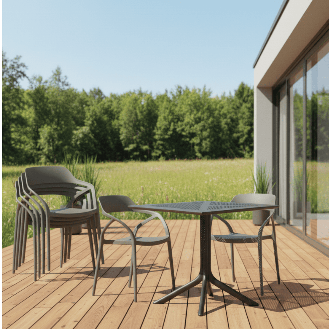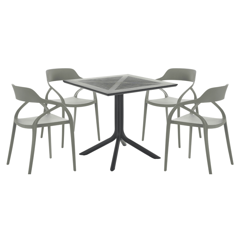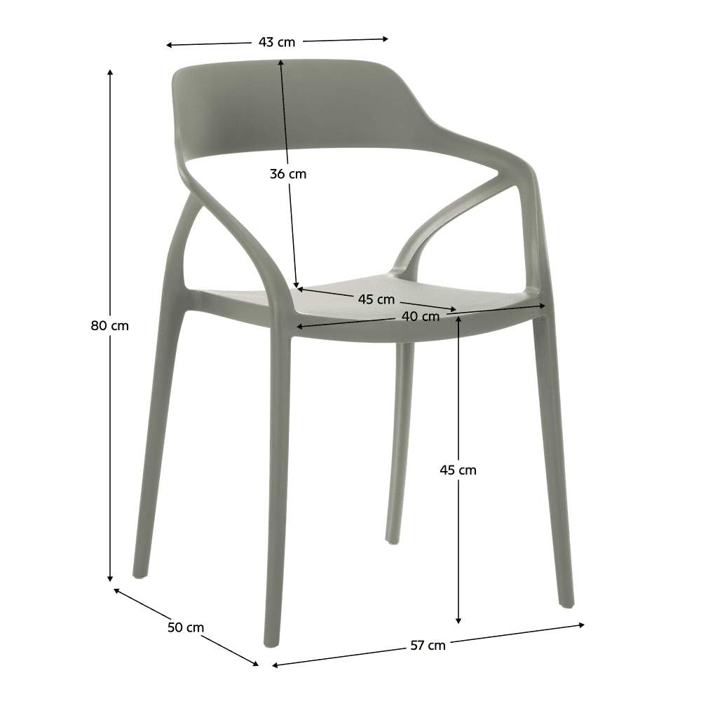 Material: plastic Culoare: gri Dimensiuni (lxAxh): 57x50x80 cm Înălţimea părţii de şezut: 45 cm Adâncimea părţii de şezut: 45 cm Lăţimea părţii de şezut: 40 cm Înălţime spate: 36 cm Lăţime spate: 43 cm Portanţă: 100 kg Greutate: 3,9 kg Scaun de sufragerie Scaun de grădină Stivuibil Potrivit pentru interior şi exterior Livrat asamblat