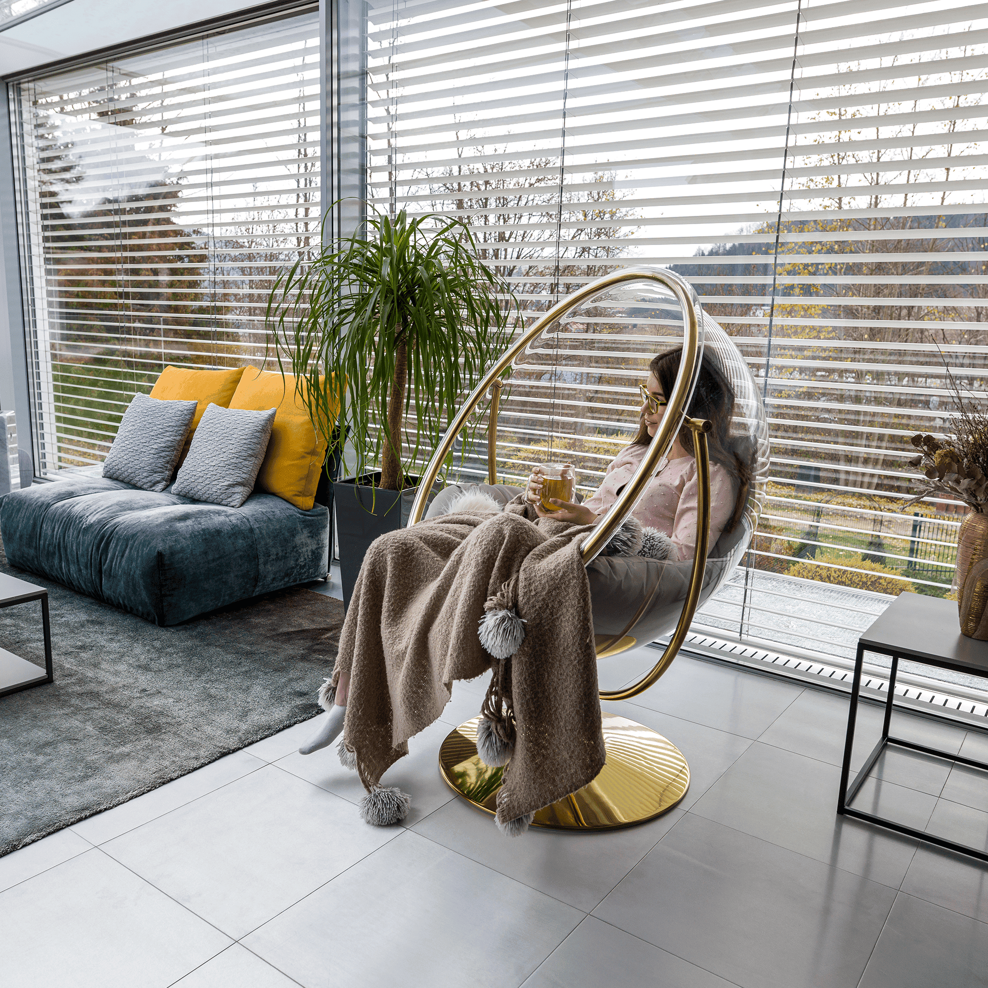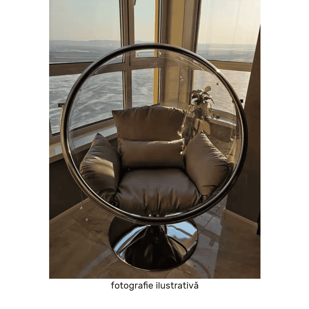 Scaun suspendat cu suport BUBBLE NEW TIP 2 Material: oţel inoxidabil/ acril/ ţesătură Rezistenţa la abraziune a ţesăturii conform testului Martindale: 95.000 abraziuni Culoare cadru: auriu Culoare acrilic: transparent Culoarea pernei: gri Dimensiuni fotoliu (LxAxÎ): 106x68x133 cm Diametru interior: 97 cm Adâncimea scaunului: 60 cm Înălţime şezut: 74 cm Greutate maximă suportată: până la 100 kg Potrivit pentru interior şi exterior Scaunul se balansează şi se roteşte Vine cu o pernă Pernele sunt impermeabile Cu fermoar pe partea inferioară a pernelor Perna mică nu are fermoar Scaunul vine cu suport Furnizat nemontat
