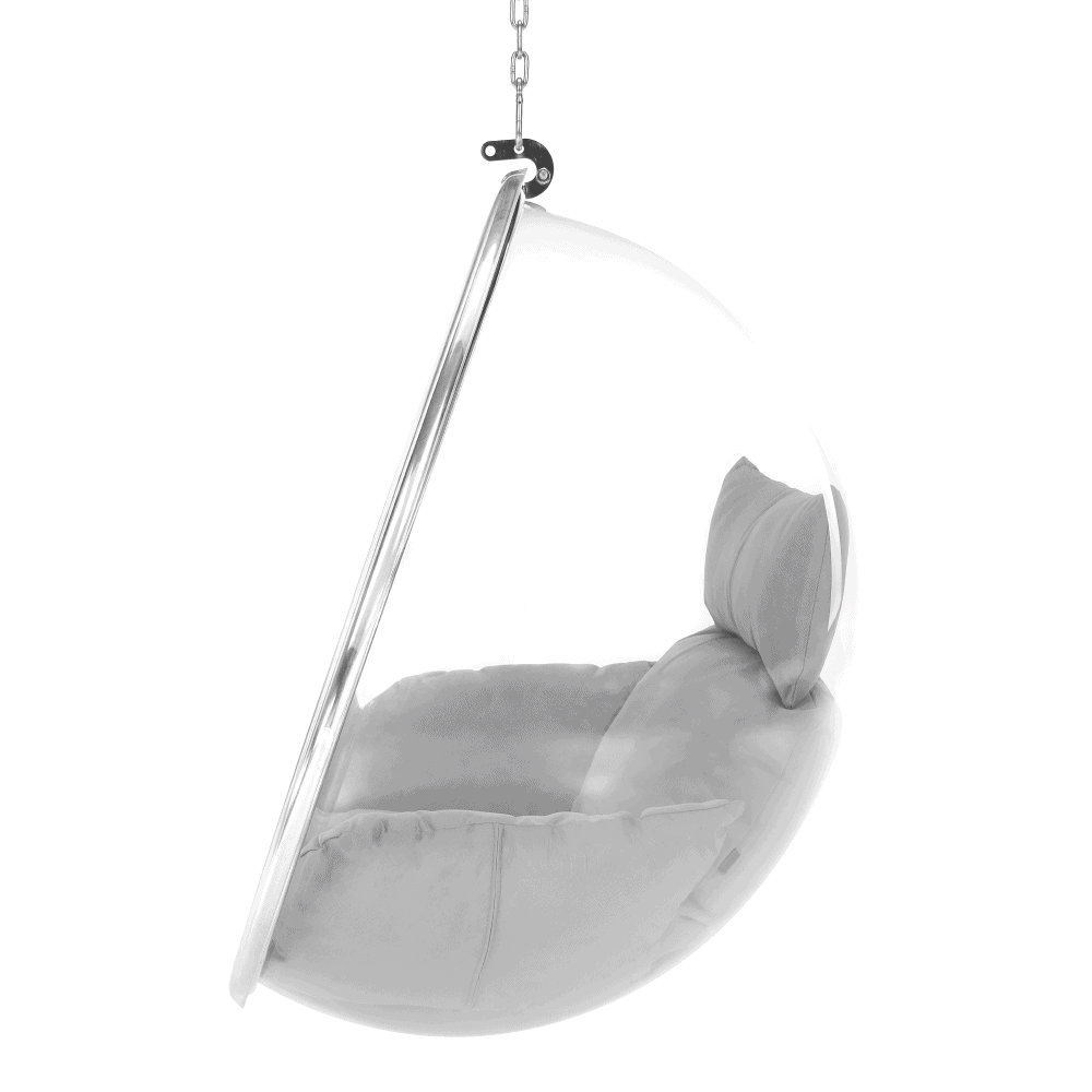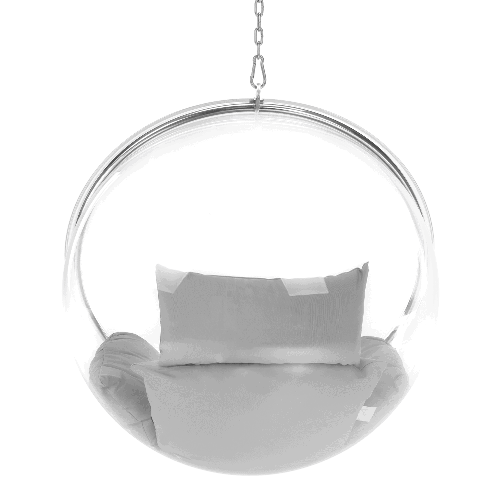 Scaun suspendat BUBBLE NEW TIP 1 Material: oţel inoxidabil/ acril/ ţesătură Rezistenţa la abraziune a ţesăturii conform testului Martindale: 95.000 abraziuni Culoare cadru: argintiu Culoare acrilic: transparent Culoarea pernei: gri Dimensiuni fotoliu (LxAxÎ): 106x62x106 cm Diametru interior: 97 cm Adâncimea scaunului: 60 cm Lungime lanţ: 200 cm Greutate maximă suportată: până la 100 kg Potrivit pentru interior şi exterior Vine cu o pernă Pernele sunt impermeabile Cu fermoar pe partea inferioară a pernei Perna mică nu are fermoar Furnizat în pachet
