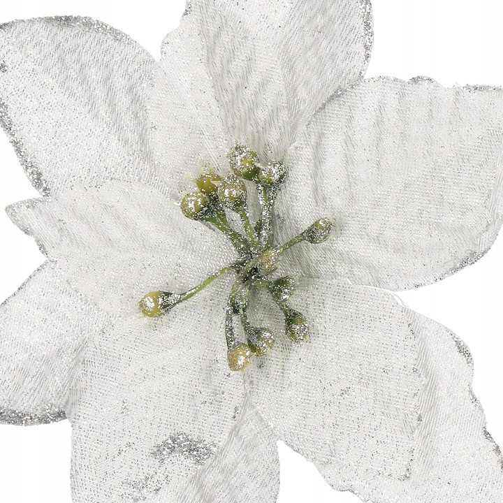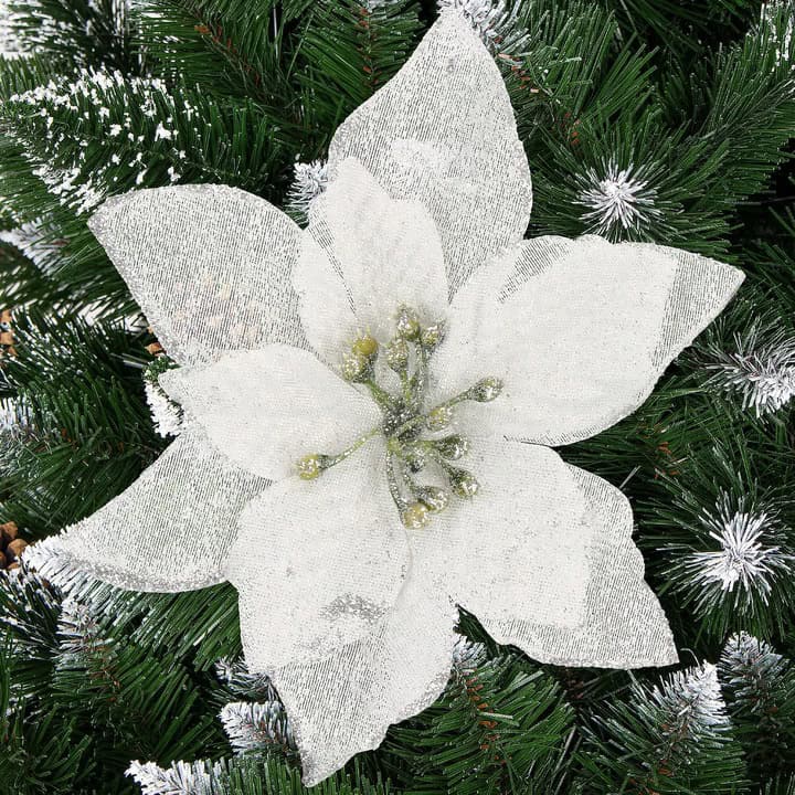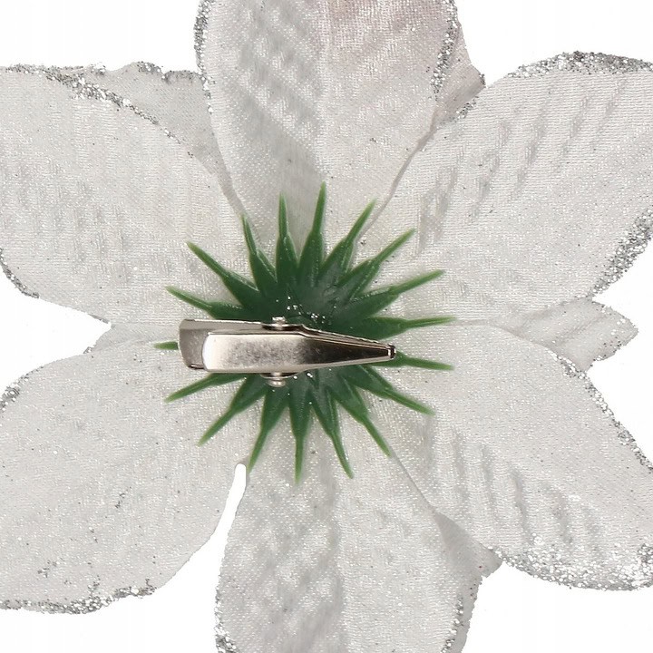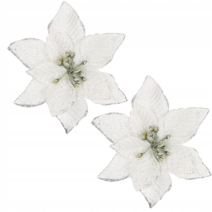 Poinsettia este cunoscuta in intreaga lume si este asociata cu Craciunul. Forma petalelor de poinsettia simbolizeaza steaua biblica a Betleemului, care a aparut adesea in casele noastre de ani de zile ca un decor unic pentru a infrumuseta sarbatoarea CraciunuluiIn ciuda faptului ca este artificiala, poinsettia va incant familia cu farmecul sau. Arata fantastic ca decor pentru o coronita de Craciun. De asemenea, va functiona foarte bine ca floare pentru aranjamentele de masa de Craciun sau ca decorare a ghirlandei. Petalele Stelei de la Bethleem sunt atasate la o clema metalica, care poate fi prinsa rapid si usor de tesaturi si crengute, astfel incat le puteti aranja cu multa libertate.Lungimea diferita a petalelor ajurate face ca floarea mare sa fie mai vizibila si mai incantatoare. Nimeni nu va trece cu indiferenta pe langa el. Lasa-ti imaginatia sa zburde, iesi in evidenta si decoreaza-ti casa cu aceste flori fermecatoare pentru a crea decoratiuni de Craciun de neuitat si, mai ales, de neegalat! aspect realist – reproduce in mod remarcabil aspectul unei flori reale, simbolul Craciunului dimensiuni mari – petale impresionante care nu pot trece neobservate in compozitiile de Craciun materiale de cea mai buna calitate – petalele sunt realizate dintr-un material carnos care seamana cu o catifea usor lucioasa posibilitatea de a se atasa la ramuri – clema metalica multe utilizari – pentru camera, ghirlande sau pe pomul de Craciun finisaj lucios – materialul lucios va adauga stralucire si va decora totul pentru un efect uimitor, mai ales dupa lasarea intunericului PARAMETRI: Culoare: gri argintiu cu sclipiciNumăr de bucăți pe pachet: 10Dimensiune: 13×13 cmNumărul de petale: 11Lungimea petalelor: aprox. 4/5/6 cmLățimea petalelor: aproximativ 2/3/4 cm.Material: plastic