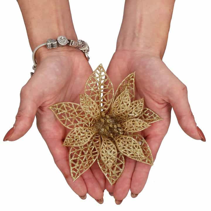 Poinsettia este cunoscuta in intreaga lume si este asociata cu Craciunul. Forma petalelor de poinsettia simbolizeaza steaua biblica a Betleemului, care a aparut adesea in casele noastre de ani de zile ca un decor unic pentru a infrumuseta sarbatoarea Craciunului In ciuda faptului ca este artificiala, poinsettia va incant familia cu farmecul sau. Arata fantastic ca decor pentru o coronita de Craciun. De asemenea, va functiona foarte bine ca floare pentru aranjamentele de masa de Craciun sau ca decorare a ghirlandei. Petalele Stelei de la Bethleem sunt atasate la o clema metalica, care poate fi prinsa rapid si usor de tesaturi si crengute, astfel incat le puteti aranja cu multa libertate. Lungimea diferita a petalelor ajurate face ca floarea mare sa fie mai vizibila si mai incantatoare. Nimeni nu va trece cu indiferenta pe langa el. Lasa-ti imaginatia sa zburde, iesi in evidenta si decoreaza-ti casa cu aceste flori fermecatoare pentru a crea decoratiuni de Craciun de neuitat si, mai ales, de neegalat! aspect realist – reproduce in mod remarcabil aspectul unei flori reale, simbolul Craciunului dimensiuni mari – petale impresionante care nu pot trece neobservate in compozitiile de Craciun materiale de cea mai buna calitate – petalele sunt realizate dintr-un material carnos care seamana cu o catifea usor lucioasa posibilitatea de a se atasa la ramuri – clema metalica multe utilizari – pentru camera, ghirlande sau pe pomul de Craciun finisaj lucios – materialul lucios va adauga stralucire si va decora totul pentru un efect uimitor, mai ales dupa lasarea intunericului PARAMETRI: Culoare: auriuNumar de bucati pe pachet: 10Diametru: 14cmNumarul de petale: 14Lungimea petalelor: 5/6cmLatimea petalelor aprox. 2/3 cmMaterial: plastic