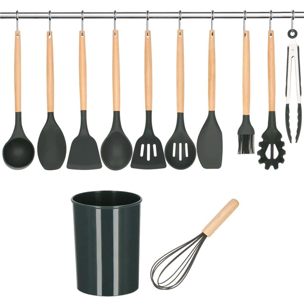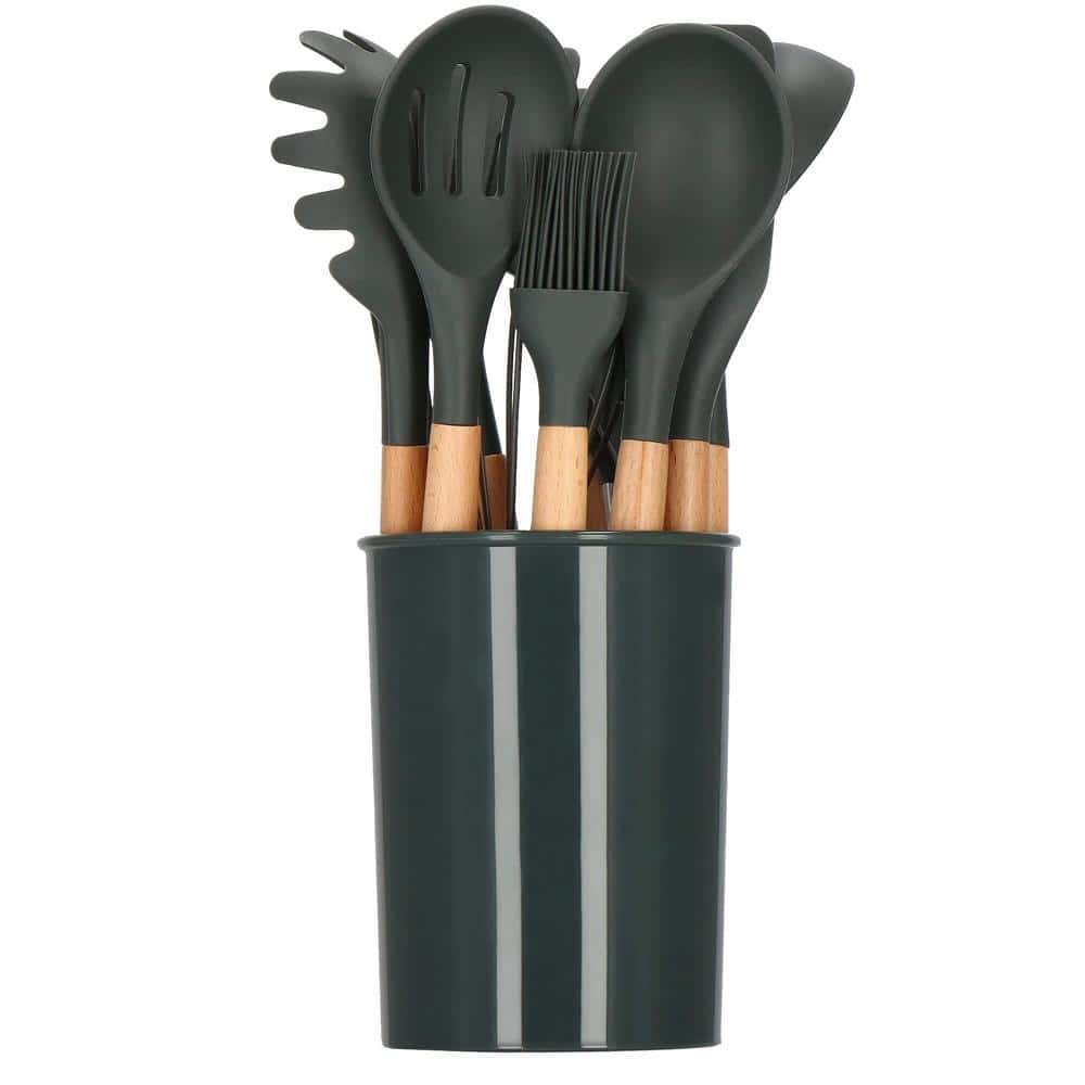 Set 12 ustensile de bucatarie din silicon termorezistent si maner din bambus, gri Mob360 – produs disponibil în magazinul Mob360.