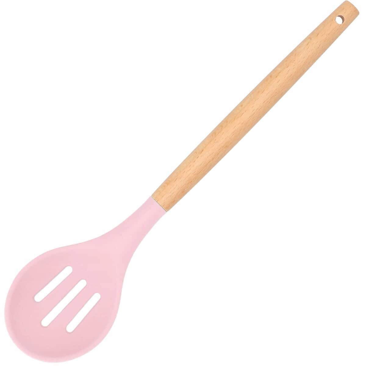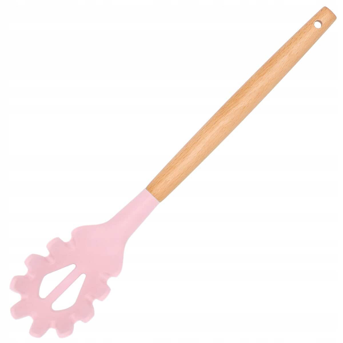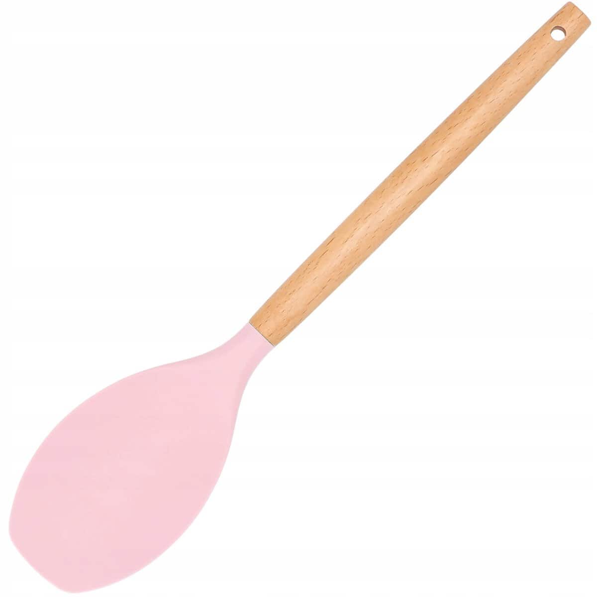 Set 12 ustensile de bucatarie din silicon termorezistent si maner din bambus, roz Mob360