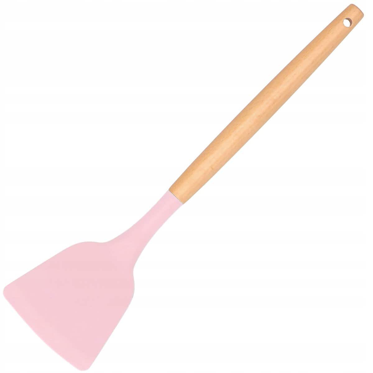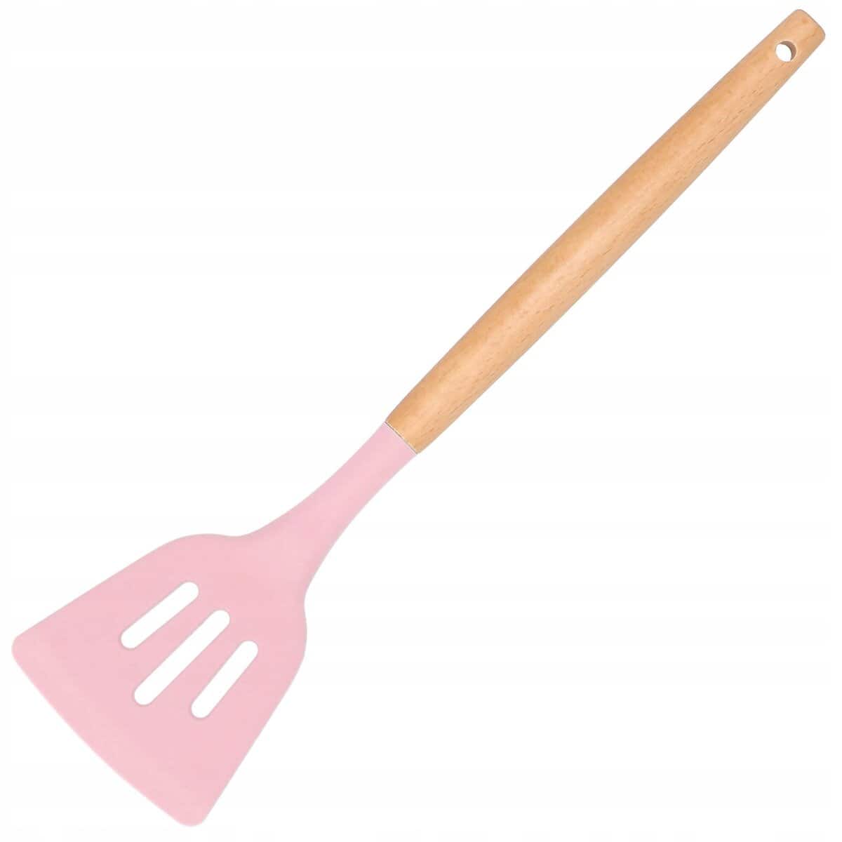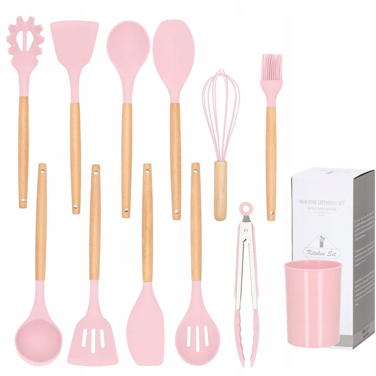 Set 12 ustensile de bucatarie din silicon termorezistent si maner din bambus, roz Mob360