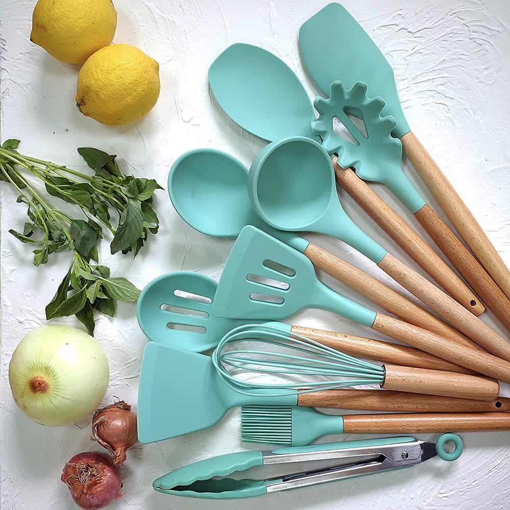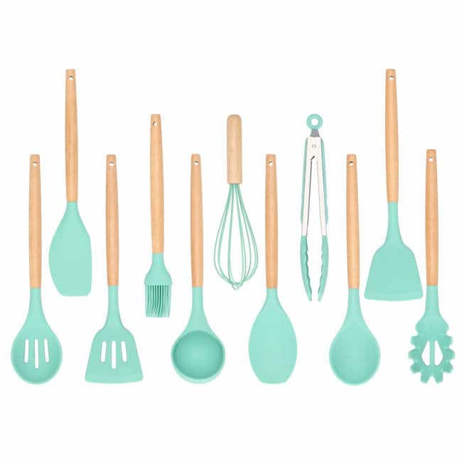 Set 12 ustensile de bucatarie din silicon termorezistent si maner din bambus, verde Mob360 – produs disponibil în magazinul Mob360.